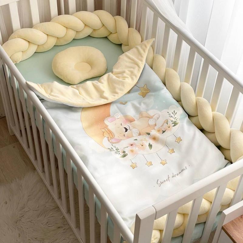 Тип кровати:стандарт, овал (60х120, 70х120) Комплектация: Бортик-коса (матеріал велюр, наповнювач холлофайбер) 220 х 17 +/- 2 см, Подушка анатомическая, Плед-конверт с одеялом, 80 Х 100+/-2 см. Бантик на резинке, Простирадло на резинці 120 Х 60 Х 15 +/- 2 см. Комплект упакован в прозрачный чемодан с ручками. Вид бортика:коса Дизайнс печатью по ткани Материал: Сатин велюр