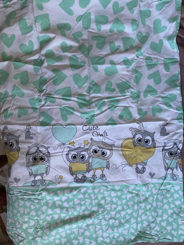 Красивий комплект для ліжечка з совами Простирадло по кутиках на резинці, наволочка та під ковдра на блискавці Стан ідеальний
