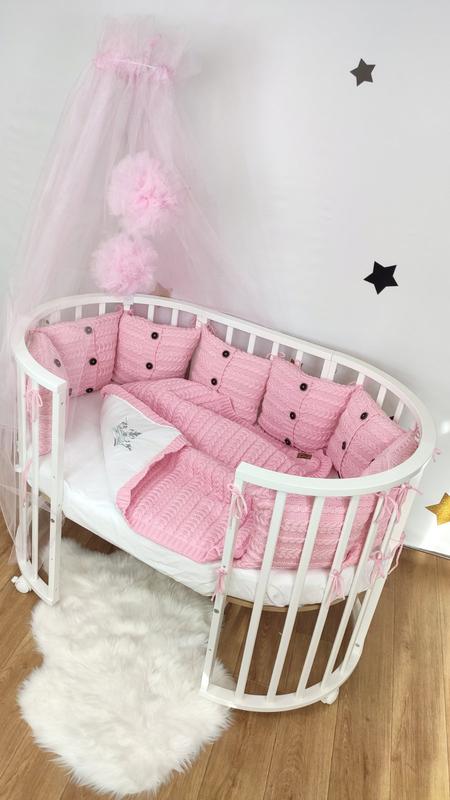 Новинка! Комплект вязаных бортиков в кроватку. Пряжа шлифованная, не колется, не кашлатится, после стирки не даёт усадку - 100 % хлопок. Комплектация: Простынь на резинке 120*60 см . 8 подушек- бортиков со съемными наволочками Размер подушки- бортика 30*30 см, наполнение холлофайбер Съёмные вязаные наволочки на трёх пуговицах . На каждой подушке по две паре завязок по всем углам. Вязанный плед- одеялко в кроватку такой же вязки, размер 80*80 см. Внутренняя часть одеялка белого цвета, декорирована серебристой вышивкой в виде Короны. Трансформируюется в конверт на выписку атласным бант- резинкой. Можно дозаказать к комплекту: - еврофатин с помпонами 6 или 9 м в различных расцветках. - балдахин с бантом белого цвета