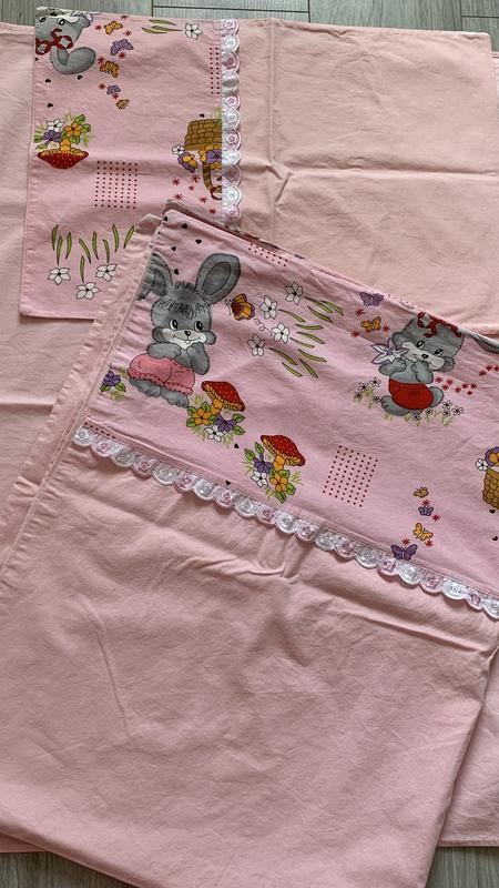 Постільна білизна для дівчинки, рожева. Простить не на резинці. Тканина бавовна, не утеплена Є плями. На фото всі плями додала. Вони не катастрофічні, не здоровенні, деякі і не помітні, але все ж вони є. Заміри: Наволочка: 39*56 Простиня : 92*143 Підодіяльник 106*136