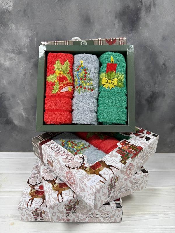 Набір рушничків з різдвяною вишивкою (3 шт) Створені для святкового настрою та тепла в домі. Упаковані стильно, готові для подарунку. Характеристики • Тканина: махра • Склад: 100% бавовна • Розмір: 30×50 см • Кількість: 3 шт • Виробник: Туреччина 🇹🇷