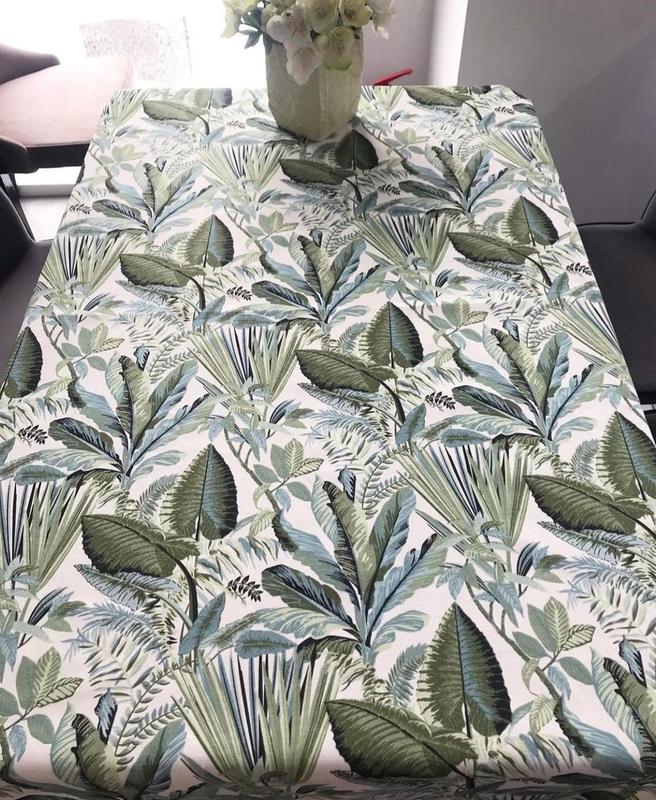 Скатерть тефлоновая водоотталкивающая хлопковая тропические листья зеленые