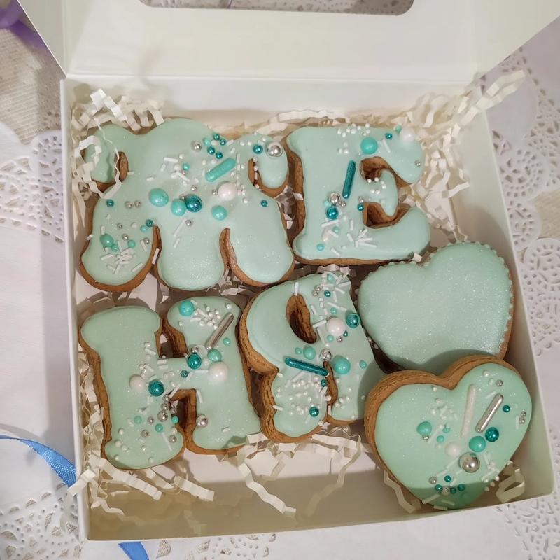 Подарунковий набір пряників-топерів. Імбирні, медові пряники, ім'я з 4 букв + 2 сердечка. Кількість букв може бути будь-яка. Ціна залежить від кількості букв. Набір можна доповнити іншими пряниками. Висота букв 5 см. Коробочка 15х15см. Декоративний паперовий наповнювач. Кожен пряник в окремій прозорій упаковці. Склад: мука пшенична, цукор, яйця, масло вершкове, мед натуральний, вода, сода харчова, сіль, імбир, кориця, мускатний горіх, ванілін, лимонна кислота, натуральні безпечні харчові барвники.