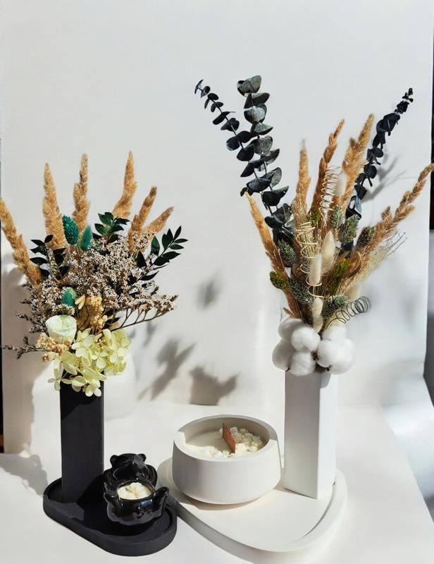 Добавьте изысканности к вашему интерьеру с нашей композицией из сухоцветов, ваз, ароматических свечей и гипсовых подставок. Идеально подходит для декора или оригинальный подарок. Особенности: • Сухоцветы: Надолго сохраняющаяся природная красота. • Вазы: Стильные и современные. • Свечи: Уютная атмосфера с приятным ароматом. • Гипсовые подставки: элегантность и прочность. Заказывайте сейчас и добавьте нотку изысканности вашей жизни! цвет ваз, аромат свечей, наполнение букетов можно менять, все изделия ручной работы