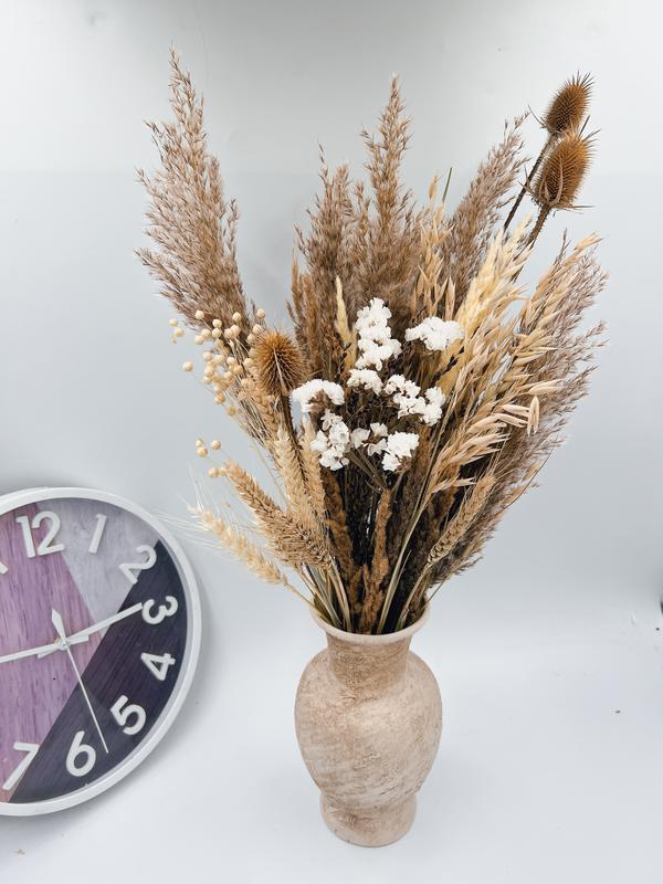 Этот букет поражает своей элегантностью и природной красотой. Он состоит из разнообразных сухоцветов, включая паспасную траву, пшеницу, ячмень, варочку и дополнительно белый кермек (сатицца), что придает ему легкость и утонченность. Высота композиции - до 60 см, каждый элемент может немного отличаться по высоте, что делает букет еще более естественным и уникальным. Этот букет станет идеальным декором для любого интерьера, подарком или даже элементом свадебного оформления. Он привнесет теплоту осени и натуральность в вашу среду, добавляя изысканности и индивидуально