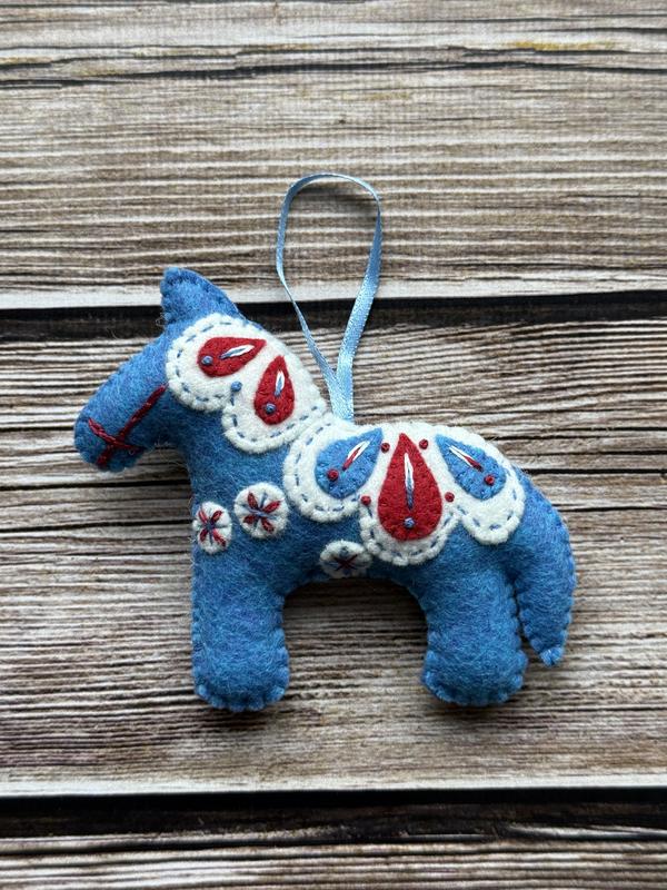 Іграшка підвіс з американського ( вовна+ віскоза) фетру. Ручна робота, ідентична вишивка з обох сторін. Наповнювач- холлофайбер, бавовняна нитка муліне.Ширина-10 см. висота-9 см, довжина петлі-6 см. Цей милий різдвяний коник ( із серії + різдв. синій козлик) буде Вашим оберегом у 2026 році.він є символом сили, волі, витривалості і руху вперед! Те, що нам потрібно! Він чудово буде дивитись і серед гілок новорічної ялинки, і на великодній гілочці, і в елегантній упаковці, очікуючи нового господаря із щирими побажаннями. Ціна 300 грн.