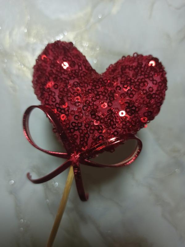 Хендмейд декор сердечка до дняпишем Валентина из блестящего текстиля - с пайетками и голограммного бифлекса с которым наполнением, на шпажке, длина изделия 31-32 см, сердечко 7×6 см. Подходит в виде декора в букет, композицию, как несъемный декор торта, как бутоньерка в карман пиджака (палочка укоротить), как домашний декор