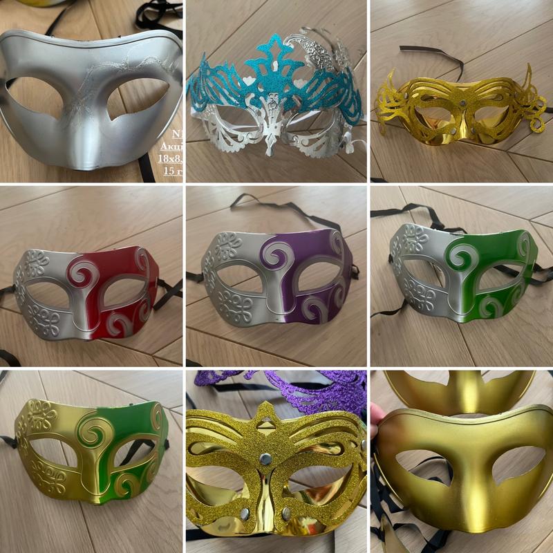 Маски різної вартості Дивіться на фото номери, за 1 шт: N3 золота пластик - 250 грн N4 пластик гладіатор різний колір ( срібло + червоний, фіолетовий, зелений ; золото + зелений ) 200 грн N6 срібло +голубий - 85 грн N7 золото жіноча - 150 грн N9 срібна пластик акційна 25грн (була поцарапана і лаком прикрили дефект)