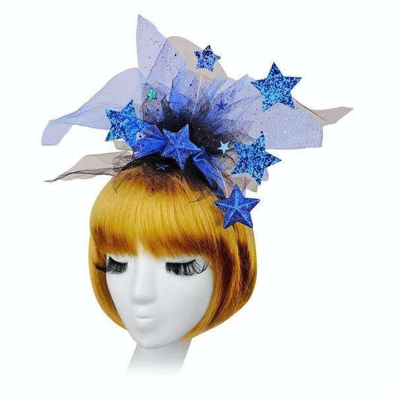 Обруч Звёздная вечеринка 18-1076BL Карнавальный обруч для образа Звездочки или других женских зимних персонажей. Подойдет и Вам на корпоративный вечер, и ребенку на утренник. Материал Обруч ― Пластик обтянутый искусственной атласной тканьюУкрашение ― пластик, проволока шенилл, фатин. Размер Композиция -до 13 см.