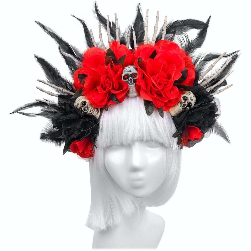 Обруч Donna Celestina 21-536BLK-RD Материал: синтетическая ткань, пластик, перо Описание: Высота композиции - 15 см. Размер черепов - 5х3 см. Оригинальный аксессуар в виде обруча, декорированного красно-чёрными розами, пластиковыми черепами, искусственными кистями скелета и перьями . Этот головной убор - великолепный выбор для фотосессии, готической вечеринки, для дополнения карнавального образа на Хэллоуин: злая колдунья, тёмная королева, ведьма, королева загробного мира. Размер универсальный.