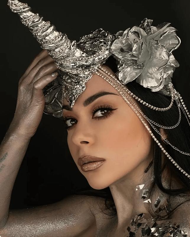 Обруч Єдиноріг New 23-539SL Фантастичний головний убір у сріблястому кольорі складається з тканинних квітів, скляних страз, ланцюжків і, звичайно ж, рідкого пластикового рогу єдинорога. Прекрасне доповнення до святкового вбрання у стилі фентезі. Ця мила та незвичайна пов'язка на голову ідеально підійде для свята, вечірки, дівич-вечора, дня народження, Хеллоуїна, фотосесії або просто на кожен день. Розмір цього головного убору універсальний для дорослої людини. На голові сидить м'яко та зручно, можна довго танцювати та рухатися. Висота композиції – до 16 см.