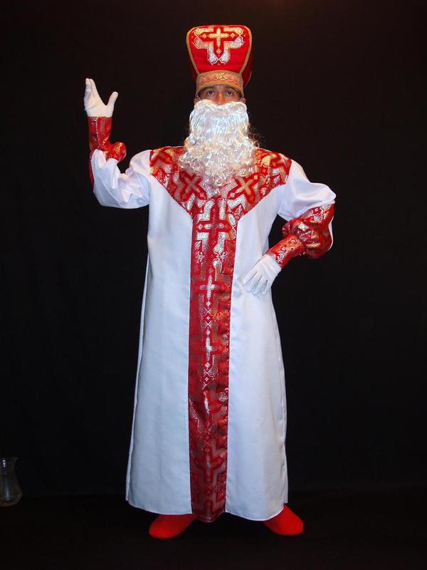 Костюм-комплект Святого Николая - ВИННИЦКИЙ-1 Код 230331 Предлагаемые размеры этой модели костюма Костюм-комплект Святого Николая - ВИННИЦКИЙ-1 отшивается в одном универсальном размере – 46-54 на рост 170-195 см В состав данного комплекта костюма входят следующие аксессуары: - Риза - длинное (почти в пол) праздничное-торжественное облачение Святого Николая из белоснежно-белого, слегка блестящего, полусинтетического (с хлопком) эффектного материала саржево-габардинного типа (производство Италия). Воротник – стойка. Рукава сложного покроя, с пышными «фонариками» – комбинированные с высокими, регулируемыми «липучками», манжетами. Риза богато украшена вышитыми золотыми металлизированными нитями по красному габардину христианскими крестами (аппликации) и другими элементами традиционной христианской символики. Риза имеет скрытую пуговичную застежку сзади, на затылке. - Уникальная шапка-митра Святого Николая - один из главных и основополагающих элементов для создания полноценного образа Святого Николая, Митра сложного кроя и изготовлена по всем канонам православной и католической церквей. Жесткость конструкции и возможность сохранять форму достигнута в митре Святого Николая благодаря инновационной технологии пошива. Изделие имеет трёхслойную структуру. Внутренний слой, прилегающий к голове при надевании шапки – шёлковая подкладка белого цвета. Средний слой - основа головного убора Святого Николая - выполнена из современного плотного и при этом тонкого корсажно-войлочного материала, обеспечивающего упругость граней шапки, что в свою очередь, позволяет не только сохранять и поддерживать изначальную форму митры, а также возможность складывания изделия по граням (при транспортировке или хранении, например) с сохранением уникальной возможности вернуть исходную форму митры при распаковке. Верхний слой митры изготовлен из качественной смесевой полусинтетической, прочной и плотной ткани, не дающей усадки и не нуждающейся в декатировке (типа саржи-габардина) ЯРКО-КРАСНОГО цвета. Головной убор Святого Николая украшен широкой кружевной ажурной бело-золотистой тесьмой по нижнему краю головного убора, а также рельефной тесьмой-«косичкой» ЗОЛОТОГО цвета по ребрам митры. Центральная часть митры украшена с лицевой стороны чрезвычайно эффектным крупным христианским крестом КРАСНОГО ЦВЕТА, расшитым ЗОЛОТЫМИ металлизированными нитями (исполнен как пришивная аппликация). - Белые нейлоновые (шитые) перчатки стретчевого типа. Код товара 12005. - Небольшая, но реалистичная борода «УЮТНАЯ». (длина: 31-33 см, вес: 40-45 гр.). Код товара 02726. В состав данного комплекта костюма НЕ ВХОДЯТ (можно приобрести на нашем сайте дополнительно): Плащаница-мантия Святого Николая, представляющая собой «плащ-накидку» прозрачно-белого цвета, выполненную из лёгкой шёлковой ткани и отороченную широкой (5 см. шириной) ажурной кружевной тесьмой, вышитой христианским каноническим орнаментом по гипюровой основе. (можно глянуть на этот аксессуар, посмотреть несколько фото и узнать о нем больше, если введёте в поисковую строку на сайте код товара: 230000 Парик Святого Николая (можно выбрать по размеру, длине, пышности, качеству волоса и цене парикСвятого Николая с учётом вашего вкуса и потребностей). Мешок для подарков Святого Николая (можно выбрать любой по размеру, ткани, цв