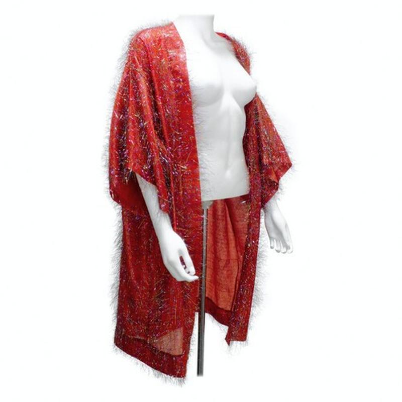 Яркая широкая накидка с блестящей нитью люрекса. Плечи опущены. Длина - 98 см. Рукав: ширина - 33 см, длина - 25 см.