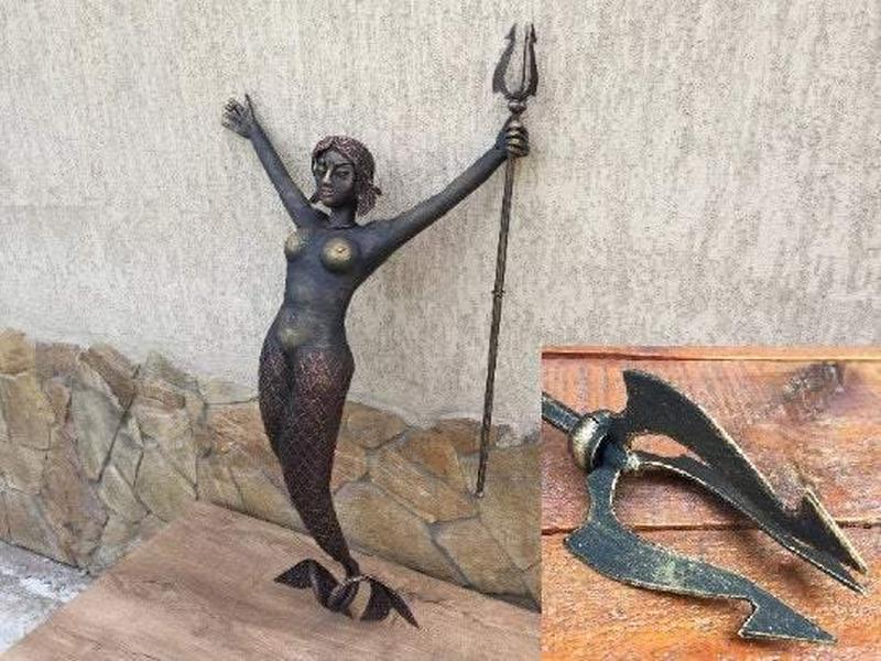 Ищете необычную русалку для своего косплея или как центральный элемент вашей вечеринки? Вот она! Эта собственноручно кованая русалка станет прекрасным дополнением к тематической вечеринке русалок, дню рождения или свадьбе, а также замечательным декором для вашего дома. Характеристики: - Высота: 106 см - Вес нетто: 10 кг Это настенная статуэтка с креплением с помощью четырех винтов (два в руках и два в ребрах). Русалка держит трезубец, который может двигаться. Каждая часть изготовлена вручную, поэтому могут происходить небольшие различия в цвете и размерах, что добавляет уникальности каждому экземпляру. Эта русалка не только придаст очарования вашему дому, но и станет высококачественным декоративным элементом, который заинтересует всех поклонников фантастических морских образов.