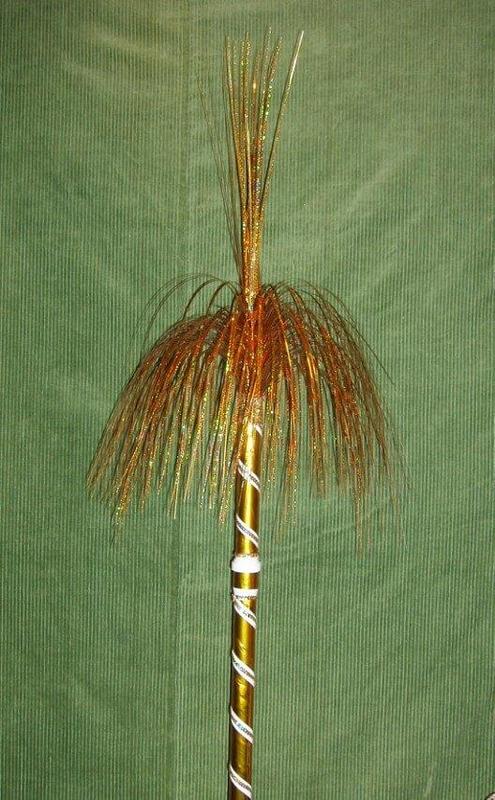 ## Посох Св. Николая/Деда Мороза разборный пластиковый (3 сегмента) - ЗОЛОТОЙ ФАКЕЛ. Код 14136 Внимание: в стоимость данного изделия не включена стоимость специальной длинномерной картонной упаковки и смягчителей, которые гарантируют сохранность посоха при транспортировки перевозчиками-посредниками. При отсылке данного товара дополнительно к стоимости товара необходимо будет оплатить 75 грн. за комплект упаковочной внешней защиты и других упаковочных материалов, обеспечивающих безопасную транспортировку изделия «ПОСОХИ ПЛАСТИКОВЫЕ РАЗБОРНЫЕ» (ППР) Посохи данной серии предназначены как для опытных и профессиональных актеров- Дедов Морозов, также и для начинающих, любителей. Особенно оценят эту серию пользователи, которые предпочитают легкие по весу посохи и которые много переезжают с костюмом и нуждаются в удобном, компактном и легковесном реквизите. Складывающиеся супер-облегченные посохи этой серии (вес посоха - всего 350-400 грамм!) состоят из 3-х сегментов, которые соединяются и разъединяются благодаря специальным, вмонтированным в соединительные муфты посоха, эластичным резиновым втулкам, обеспечивающие плотное и мягкое соединение между собой сегментов. Такая оригинальная система соединения частей посоха обеспечивает удивительно прочное и надежное соединение сегментов при его сборке. Время сборки посоха – 10 секунд! Те же 10-15 секунд уйдет на разборку посоха. Уникальность втулочного соединения гарантирует в посохах этой серии 300-400 тысяч операций по соединению-разъединению сегментов! Основа посохов серии ППР украшается пленками (производство Германии, Бельгии, Франция, США), декоративными ткаными и неткаными лентами, ленточными пайетками, как правило, серебристо-красных, серебристо-синих, золотисто- красных, золотисто-синих, серебристых, золотистых и серебристо-золотистых тонов часто в сочетении с белым цветом (снежным). Цветовая палитра оснований посоха позволяет гармонично подобрать такой посох к костюму практически любой расцветки. Подпятник посоха – специальная двойная полипропиленовая опора, которая не дает возможности деформироваться декору основания посоха, предохраняя тем самым нижнюю кромку нижнего, 3-го, сегмента посоха. Верхушками для посохов этой серии являются всевозможные звезды, ёлочки, ветки, шары, остроконечные конусы-шпили и другие. Разнообразие форм и цветовых решений верхушек посохов этой серии гарантируют удачный подбор посоха к конкретному костюму пользователя. Посох серии ППР поставляется в полном комплекте, в разборном виде. Для изделий этой серии используются 2 вида упаковки- вначале мягкая, затем твердая. При мягкой упаковке каждый из трех сегментов посоха упаковывается в специально сшитые по диаметру сегментов посоха мягкие и эластичные полипропиленовые чехлы, которые можно использовать и для дальнейшей эксплуатации посоха при хранении и перевозках (чехлы входят в указанную стоимость комплектного изделия) и /или же в стрейч-пленку. Твердая упаковка используется, как правило, при отправке посохов ППР-серии по почте. В качестве твердой упаковки используется специальная, соответствующая габаритам изделия, гофрокартонная тара, защищающая посох при транспортировке (гофротара не входит в стоимость изделия и оплачивается покупателем дополнительно вместе с оплатой почтового тари