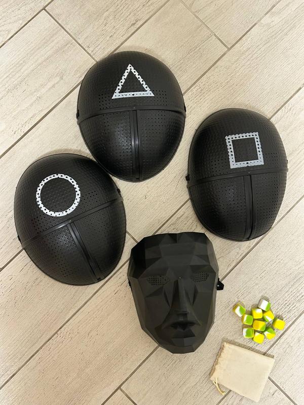 Гра в кальмара: 4 маски и гра гонги 10 кубиков в мешочке