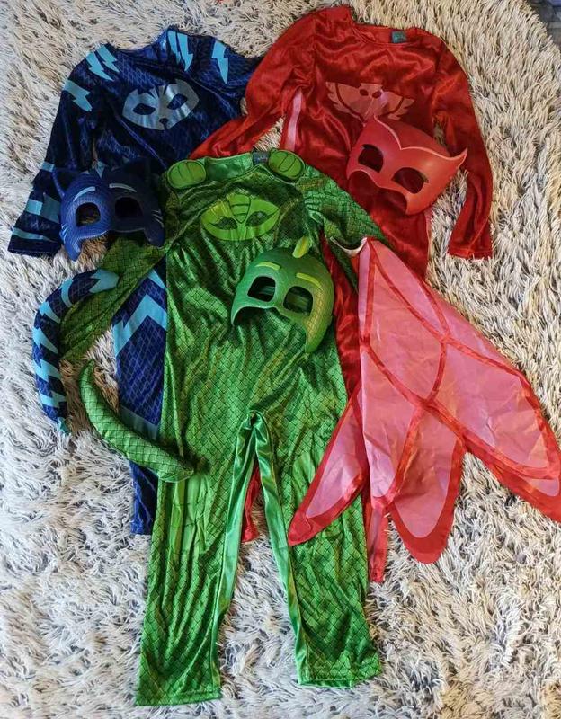 Цена указана за 1 костюм. Комплектация на фото (хвосты,маски,крылья). Замеры: 1.Гекко ,по бирке PJ MASKS ,5/6 лет, 116 см ПОГ - 34 см ПОТ - 32 см ПОБ - 36 см Шаг - 45 см Длина рукава - 40 см Длина хвоста - 30 см От плеча до низа - 95 см 2.Кэтбой ,по бирке PJ MASKS ,5/6 лет, 116 см ПОГ - 34 см ПОТ - 32 см ПОБ - 36 см Шаг - 44 см Длина рукава - 40 см Длина хвоста - 35 см От плеча до низа - 94 см 3.Алетт, по бирке PJ MASKS ,7/8 лет, 122-128 см ПОГ - 35 см ПОТ - 34 см ПОБ - 38 см Шаг - 50 см Длина рукава - 46 см От плеча до низа - 105 см Могу прислать дополнительно фото. По всем интересующим вопросам пишите. Шафа доставкой отправляю. Смотрите другие мои объявления. Всем мирного неба и приятных покупок.