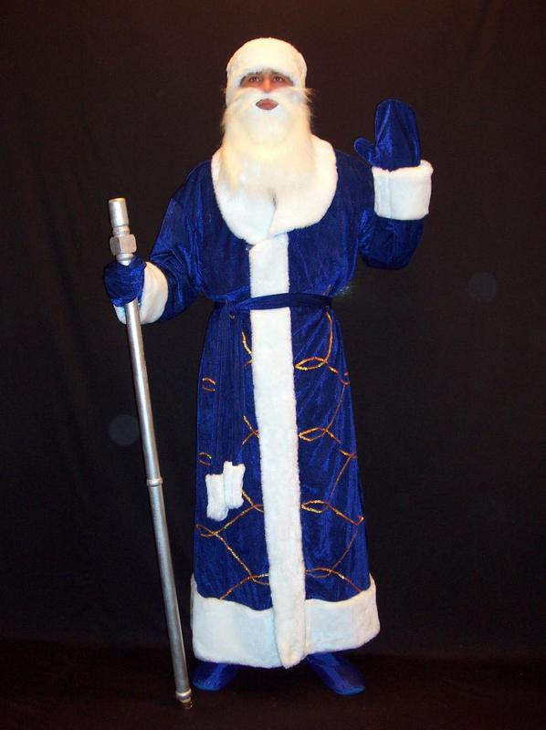 ## Костюм Св.Миколая/Д.Мороза ОКСАМИТОВИЙ СИНІЙ-2 р-р 48-56 Код 107982 Комплект-костюм Діда Мороза «Оксамитовий Синій-2» відшитий в одному універсальному розмірі - чудово підійде в рамках розмірів 48-56 і на зріст від 170 до 195 см У комплект костюма входить: 1. Шуба Діда Мороза на підкладці з ГЛИБОКО-СИНЬОГО ЩІЛЬНОГО СТРЕЙЧ-ВЕЛЮР-Оксамита, облямована білим хутром-мутоном, з вишивкою золотистими, що переливаються на світлі, паєтками на полицях шуби. 2. Шапка на підкладці, з ГЛИБОКО-СИНЬОГО ЩІЛЬНОГО СТРЕЙЧ-ВЕЛЮР-Оксамиту, облямована хутром мутоном. 3. Пояс із ГЛИБОКО-СИНЬОГО ЩІЛЬНОГО СТРЕЙЧ-ВЕЛЮР-ОКСАМИТУ з хутряними облямівками на кінцях. 4. Рукавиці на підкладці, з ГЛИБОКО-СИНЬОГО ЩІЛЬНОГО СТРЕЙЧ-ВЕЛЮР-Оксамиту, облямовані хутром. 5. Борода з довговорсового хутра велика з прорізом для рота (довжина 50 см, щира – 30 см) У комплект костюма Діда Мороза «Оксамитовий Синій-2» НЕ ВХОДЯТЬ (можна придбати на нашому сайті додатково): - Перука Діда Мороза (можна вибрати будь-яку за розміром, довжиною, пишнотою, якістю волосся та ціною перуку Діда Мороза з урахуванням вашого смаку та потреб ). - Посох Діда Мороза (можна вибрати будь-який за розміром, довжиною, типом верхівки, кольором і матеріалом виготовлення, конструкції (збірний або цільний) і ціною посох Діда Мороза з урахуванням вашого смаку та потреб). - Чоботи або валянки Діда Мороза (можна купити додатково на нашому сайті) різні за технологією виготовлення, матеріалом, висотою халяви, ціною - чоботи або валянки Діда Мороза. - Мішок для подарунків (можна вибрати будь-який за розміром, тканиною, кольором і колірними відтінками, з декором і без, із зав'язками простими або зі шнуром і хутряними облямівками). - Мікрофон портативний з підсилювачем та динаміком та модератором-змінником голосу.