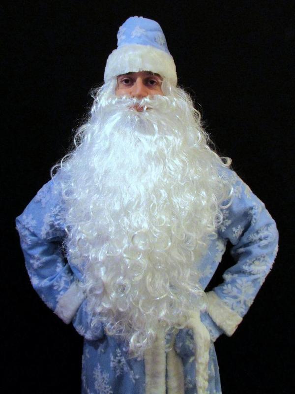 ## Костюм Св.Николая/Д.Мороза РАСПИСНОЙ СИНИЙ-7 р-р 48-54 Код 107887 Костюм отшит в одном размере. Подходит на 48-54 размеры и на рост 170-190 см В комплект костюма Деда Мороза «РАСПИСНОЙ СИНИЙ-7» входит: 1. Шуба Деда Мороза из сине-голубого велюра с рельефным рисунком в виде разно-размерных белых снежинок и зимних узоров 2. Шапка из основной ткани с рельефным рисунком в виде разно-размерных белых снежинок и зимних узоров, отороченная белым мехом 3. Пояс из белого меха 4. Рукавицы из основной ткани, с рельефным рисунком в виде разно-размерных белых снежинок и зимних узоров, отороченные мехом 5. Мешок Деда Мороза из СИНЕГО атласа. (50х75 см)Большая реалистическая, пушистая 6. Борода из искусственного волоса «РЕАЛЬНАЯ». Код 02707. Длина 60 см., вес: 140 грамм 7. Великолепный длинный парик «Белый снег» под стать бороде. Код 01704. Длина 55-65 см, вес 145-150 грамм) В комплект костюма Деда Мороза «РАСПИСНОЙ СИНИЙ-7» НЕ ВХОДЯТ (можно приобрести на нашем сайте дополнительно): - Посох Деда Мороза (можно выбрать любой по размеру, длине, типу верхушки, цвету и материалу изготовления, конструкции (сборный или цельный) и цене посох Деда Мороза с учётом вашего вкуса и потребностей). - Сапоги или валенки Деда Мороза (можно купить дополнительно на нашем сайте) различные по технологии изготовления, материалу, высоте голенища, цене - сапоги или валенки Деда Мороза. - Брюки Деда Мороза (можно купить дополнительно на нашем сайте). Есть все размеры брюк, на любой рост. Цвета – красный, синий, бордовый. - Микрофон портативный с усилителем и динамиком и модератором-изменителем голоса.