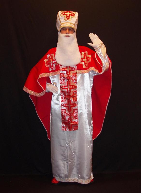 ## Костюм-комплект Святого Николая - ЖИТОМИРСКИЙ-2 р-р 50-56. Код 230042 Костюм-комплект Святого Николая - ЖИТОМИРСКИЙ-2 отшивается в одном универсальном размере – 50-56 на рост 175-190 см В комплект костюма Святого Николая «ЖИТОМИРСКИЙ-2» входят: 1. Нижнее длинное облачение Святого Николая из белоснежного блестящего атласа или полусинтетической саржи-габардина, отороченная широкой бело-золотистой тесьмой по подолу и рукавам. 2. Верхнее парадно-праздничное облачение Святого Николая из полусинтетической саржи-габардина КРАСНОГО цвета, отороченное широкой бело-золотистой тесьмой по краю и вороту и богато украшенное вышитыми крестами (аппликации) и дополненная нарядной ризой красного цвета с вышитыми серебристыми крестами и символикой христианской тематики. 3. Шапка-митра Святого Николая на плотной корсажно-войлочной подкладке, верх - из полусинтетической саржи-габардина БЕЛОГО цвета. Митра украшена широкой бело-золотистой тесьмой по нижнему краю, тесьмой-косичкой золотистого цвета по ребрам митры, а также дополненная крестом (аппликация), вышитым серебряными нитями. 4. Белые нейлоновые (вязанные) перчатки стрейчевого типа Код 12005. 5. Меховая большая борода «Окладистая». Код 02727. Длина – 44 см, ширина – 30 см. В комплект костюма Святого Николая «ЖИТОМИРСКИЙ-2» НЕ ВХОДЯТ (можно приобрести на нашем сайте дополнительно): - Парик Святого Николая (можно выбрать по размеру, длине, пышности, качеству волоса и цене парик Святого Николая с учётом вашего вкуса и потребностей). - Посох Святого Николая (можно выбрать по размеру, длине, типу верхушки, цвету и материалу изготовления, конструкции (сборный или цельный) и цене посох Святого Николая с учётом вашего вкуса и потребностей). - Сапоги или валенки Святого Николая (можно купить дополнительно на нашем сайте различную обувь по технологии изготовления, материалу, высоте голенища, цене) - Брюки Святого Николая (можно выбрать по размеру, ткани, цвету). - Мешок для подарков Святого Николая (можно выбрать любой по размеру, ткани, цвету и цветовым оттенкам, с декором и без, с завязками простыми или со шнуром или меховыми опушками). - Микрофон портативный с усилителем и динамиком