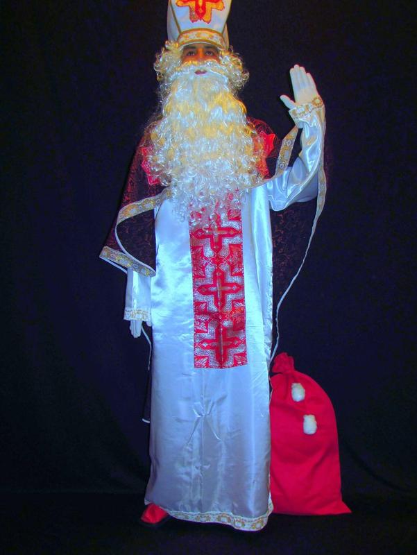 ## Костюм-комплект Святого Николая - КАРПАТСКИЙ-5 р-р 50-56. Код 230055 Костюм-комплект Святого Николая - КАРПАТСКИЙ-5 отшивается в одном универсальном размере – 50-56 на рост 175-190 см В комплект костюма Святого Николая «КАРПАТСКИЙ-5» входят: 1. Нижнее длинное облачение Святого Николая из белоснежного блестящего атласа или полусинтетической саржи-габардина, отороченная широкой бело-золотистой тесьмой по подолу и рукавам. 2. Верхнее парадно-праздничное облачение Святого Николая из плотного благородного жаккарда черно-красных тонов, отороченное широкой бело-золотистой тесьмой по краю и вороту и богато украшенное вышитыми крестами (аппликации) и дополненная нарядной ризой красного цвета с вышитыми серебристыми крестами и символикой христианской тематики. 3. Шапка-митра Святого Николая на плотной корсажно-войлочной подкладке, верх - из полусинтетической саржи-габардина БЕЛОГО цвета. Митра украшена широкой бело-золотистой тесьмой по нижнему краю, тесьмой-косичкой золотистого цвета по ребрам митры, а также дополненная крестом (аппликация), вышитым серебряными нитями. 4. Белые нейлоновые (вязанные) перчатки стрейчевого типа Код 12005. 5. Реалистичная большая борода «ЗНАТНАЯ» (55 см, 125 гр.) Код 02716. 6. Реалистичный вьющийся парик «Декабрьский». Код 01702. Вес – 120 грамм 7. Вместительный мешок для подарков красного цвета «ФАРТОВЫЙ» (48х75 см) с меховыми бубонами на завязках. Код 12030 В комплект костюма Святого Николая «КАРПАТСКИЙ-5» НЕ ВХОДЯТ (можно приобрести на нашем сайте дополнительно): - Посох Святого Николая (можно выбрать по размеру, длине, типу верхушки, цвету и материалу изготовления, конструкции (сборный или цельный) и цене посох Святого Николая с учётом вашего вкуса и потребностей). - Сапоги или валенки Святого Николая (можно купить дополнительно на нашем сайте различную обувь по технологии изготовления, материалу, высоте голенища, цене) - Брюки Святого Николая (можно выбрать по размеру, ткани, цвету). - Микорофон портативный с усилителем и динамиком