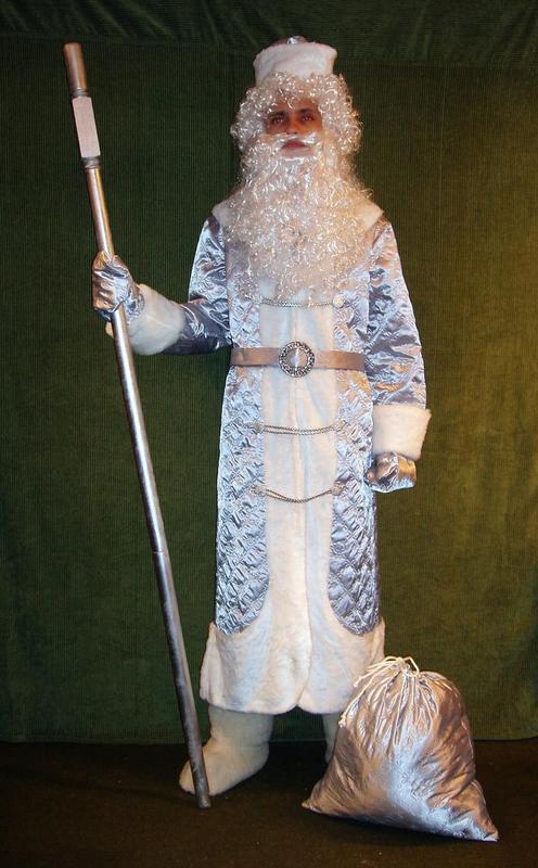 ## Костюм Св.Николая/Д.Мороза СЕРЕБРЯНЫЙ ХРОМ-2 р-р 48-52 Код 108012 В комплект костюма входит: 1. Костюм-шуба на шелковой подкладке 2. Шапка. отороченная мехом, на подкладке 3. Рукавицы из основной ткани костюма, изнутри подшитые шёлком 4. Пояс с изящной крупной пряжкой 5. Добротная реалистичная борода "ВЛАСТНАЯ". Код товара 02719. (длина 40-45 см, вес - 65-75 г). 6. Кучерявый эффектный, реалистический парик "НОВОГОДНИЙ". Код товара 01706. (125 грамм) Блеск нестандартной тканевой фактуры этого костюма, таинственная рельефность фигурно простёганной поверхности ткани и потрясающий цвет, в котором совместились мягкие оттенки серебра и ослепляющий цвет хрома – первое, что бросается в глаза при знакомстве с костюмом "СЕРЕБРЯНЫЙ ХРОМ-2". Торжество цвета и блеска! Разработан костюм нашими дизайнерами по одежде и модельерами на основе пожеланий наших постоянных покупателей, которые были предварительно опрошены с целью выяснения, какой костюм они хотели бы видеть (наверное, уж сильно всех достало однообразие и ассортиментная скука на сайтах…) Модель универсальна по назначению – она рассчитана как на профи-актеров, так и на «любителей», новичков. Справедливо будет заметить, что костюм не простенький и может смело и решительно претендовать на оригинальность и, уж что точно не отнимешь у этой модели, - элегантность. Явную (и даже наглую!) эффектность внешнего вида костюма «СЕРЕБРЯНЫЙ ХРОМ-2» определяет фактурная необычность ткани и мерцающий, изменчивый цвет, который переходит из серебристого в хромовый блеск, из хрома в белый, в стальной, в жемчужный… Кстати, все эти цвета и оттенки своей игрой и переливами отвечают самым строгим цветовым канонам классического, традиционного славянского костюма, где превалировали все оттенки белого и серебристого. Костюм "СЕРЕБРЯНЫЙ ХРОМ-2" изготовлен из высококачественного креп-атласа, фигурно простеганного с тонким сентапоном, который позволяет удерживать форму изделия, исключает появление нежелательных примятостей, страхует от предательского вытягивания основной ткани, позволяет напрочь избежать любой амортизационной деформации изделия, продлевая ему жизнь «в свежести» на долгие годы. Костюм – шуба застегивается на потайные крючки: металлические, специальные, шубные, надежные, долговечные. Таким образом, шуба не запахивается полками друг на друга, как халат, а, как модельный костюм, застегивается полками встык. Кроме того. шуба комплекта декорирована серебристо-хромовыми шнурами, которые имитируют застежки (их всего три), выполненные в стиле княжеских костюмов. Дополняют и прекрасно освежают застежки – шесть крупных рельефных блестящих пуговиц. Широкий шалевый воротник костюма выполнен из недлинноворсового, а короткостриженого искусственного меха класса "мутон", однако этот мех редко- высокого качества. Это вид меха имеет особое свойство – он блестит каждой своей «шерстинкой-меховинкой», отражая свет и дополняя серебристо-хромовые блестящие переливы простеганной основной ткани костюма. Потому, весь костюм, как будто подсвечивается изнутри, сверкает и переливается. Очень удачное решение, которое по достоинству оценили наши покупатели. Обе полки,рукава и низ шубы также оторочены широкими полосами того же белоснежного сверкающего в свету меха. При этом внизу меховой декор полок костюма переходит в меховую отор