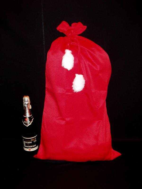 ## Мешок Св.Николая/Деда Мороза/Санты (85х48) ВМЕСТИТЕЛЬНЫЙ красный с бубонами. Код 12035 РАЗМЕРЫ: ВЫСОТА – 85 см, ШИРИНА – 48 см. ОПИСАНИЕ ТКАНИ И ТОВАРА: плотная и прочная х/б ткань типа коттон - саржа + тесьма-шнур в тон цвета - в качестве завязок (возможно использование вместо шнура завязок из той же ткани). На концах зявязок – опушка: пушистые бубоны из белого меха – мутона.