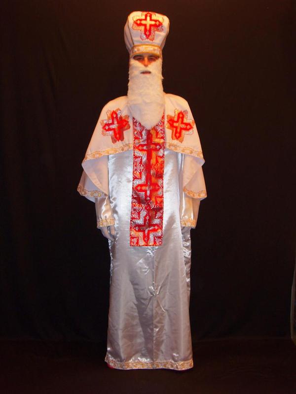 ## Костюм-комплект Святого Николая - ПЕРЕЯСЛАВСКИЙ-2 р-р 50-56. Код 230112 Костюм-комплект Святого Николая - ПЕРЕЯСЛАВСКИЙ-2 отшивается в одном универсальном размере – 50-56 на рост 175-190 см В комплект костюма Святого Николая «ПЕРЕЯСЛАВСКИЙ-2» входят: 1. Нижнее длинное облачение Святого Николая из белоснежного блестящего атласа или полусинтетической саржи-габардина, отороченная широкой бело-золотистой тесьмой по подолу и рукавам. 2. Верхнее парадно-праздничное облачение Святого Николая из полусинтетической саржи-габардина (или атласа) БЕЛОГО цвета, отороченное широкой бело-золотистой тесьмой по краю и вороту и богато украшенное вышитыми крестами (аппликации) и дополненная нарядной ризой красного цвета с вышитыми серебристыми крестами и символикой христианской тематики. 3. Шапка-митра Святого Николая на плотной корсажно-войлочной подкладке, верх - из полусинтетической саржи-габардина БЕЛОГО цвета. Митра украшена широкой бело-золотистой тесьмой по нижнему краю, тесьмой-косичкой золотистого цвета по ребрам митры, а также дополненная крестом (аппликация), вышитым серебряными нитями. 4. Белые нейлоновые (вязанные) перчатки стрейчевого типа Код 12005. 5. Меховая борода «ВАЛЕТ» (38*25 см). Код 02732 В комплект костюма Святого Николая «ПЕРЕЯСЛАВСКИЙ-2» НЕ ВХОДЯТ (можно приобрести на нашем сайте дополнительно): - Парик Святого Николая (можно выбрать по размеру, длине, пышности, качеству волоса и цене парик Святого Николая с учётом вашего вкуса и потребностей). - Посох Святого Николая (можно выбрать по размеру, длине, типу верхушки, цвету и материалу изготовления, конструкции (сборный или цельный) и цене посох Святого Николая с учётом вашего вкуса и потребностей). - Сапоги или валенки Святого Николая (можно купить дополнительно на нашем сайте различную обувь по технологии изготовления, материалу, высоте голенища, цене) - Брюки Святого Николая (можно выбрать по размеру, ткани, цвету). - Мешок для подарков Святого Николая (можно выбрать любой по размеру, ткани, цвету и цветовым оттенкам, с декором и без, с завязками простыми или со шнуром или меховыми опушками). - Микрофон портативный с усилителем и динамиком