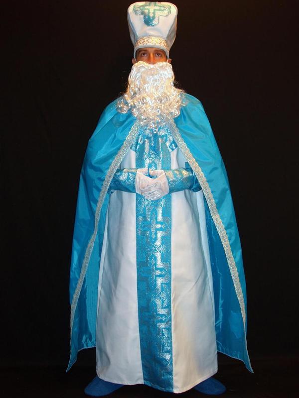 ## Костюм-комплект Святого Николая - БРОВАРСКОЙ-1 р-р 46-54. Код 230441 Костюм-комплект Святого Николая - БРОВАРСКОЙ-1 отшивается в одном универсальном размере – 46-54 на рост 170-195 см В состав данного комплекта костюма входят следующие аксессуары: 1. Риза - длинное (почти в пол) праздничное-торжественное облачение Святого Николая из белоснежно-белого, слегка блестящего, полусинтетического (с хлопком) эффектного материала саржево-габардинного типа (производство Италия). Воротник – стойка. Рукава сложного покроя, с пышными «фонариками» – комбинированные с высокими, регулируемыми «липучками», манжетами. Риза богато украшена вышитыми серебристыми металлизированными нитями по бирюзовому габардину христианскими крестами (аппликации) и другими элементами традиционной христианской символики. Риза имеет скрытую пуговичную застежку сзади, на затылке. 2. Длинная плащаница-мантия Святого Николая бирюзового цвета, выполненная из лёгкой «летучей» плащёвки и декорированная по периметру кружевной ажурной широкой (5 см) тесьмой с христианской символикой, выполненной ажурной машинной вышивкой в стилизации канонического орнамента по гипюровой основе. Вышивка выполнена золотыми нитями. Мантия надевается поверх ризы и очень эффектна. При движении она «развевается» от движения ветра, предавая ощущения динамики. 3. Уникальная шапка-митра Святого Николая - один из главных и основополагающих элементов для создания полноценного образа Святого Николая, Митра сложного кроя и изготовлена по всем канонам православной и католической церквей. Жесткость конструкции и возможность сохранять форму достигнута в митре Святого Николая благодаря инновационной технологии пошива. Изделие имеет трёхслойную структуру. Внутренний слой, прилегающий к голове при надевании шапки – шёлковая подкладка белого цвета. Средний слой - основа головного убора Святого Николая - выполнена из современного плотного и при этом тонкого корсажно-войлочного материала, обеспечивающего упругость граней шапки, что в свою очередь, позволяет не только сохранять и поддерживать изначальную форму митры, а также возможность складывания изделия по граням (при транспортировке или хранении, например) с сохранением уникальной возможности вернуть исходную форму митры при распаковке. Верхний слой митры изготовлен из качественной смесевой полусинтетической, прочной и плотной ткани, не дающей усадки и не нуждающейся в декатировке (типа саржи-габардина) БЕЛОСНЕЖНО- БЕЛОГО цвета. Головной убор Святого Николая украшен широкой кружевной ажурной бело-золотистой тесьмой по нижнему краю головного убора, а также рельефной тесьмой-«косичкой» ГЛУБОКОГО ТЁМНО-СИНЕГО цвета по ребрам митры. Центральная часть митры украшена с лицевой стороны чрезвычайно эффектным крупным христианским крестом БИРЮЗОВОГО ЦВЕТА, расшитым СЕРЕБРЯНЫМИ металлизированными нитями (исполнен как пришивная аппликация). 4. Белые нейлоновые (шитые) перчатки стретчевого типа. Код товара 12005. 5. Небольшая, но реалистичная борода «УЮТНАЯ». (длина: 31-33 см, вес: 40-45 гр.). Код товара 02726. В состав данного комплекта костюма НЕ ВХОДЯТ (можно приобрести на нашем сайте дополнительно): - Парик Святого Николая (можно выбрать по размеру, длине, пышности, качеству волоса и цене парикСвятого Николая с учётом вашего вкуса и потребностей). - Мешок для по