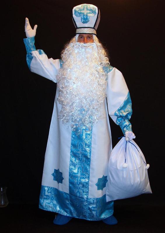 ## Костюм-комплект Святого Николая - ЛЬВОВСКИЙ-6 р-р 46-54 Код 230356 Костюм-комплект Святого Николая - ЛЬВОВСКИЙ-6 отшивается в одном универсальном размере – 46-54 на рост 170-195 см В состав данного комплекта костюма входят следующие аксессуары: 1. Риза - длинное (почти в пол) праздничное-торжественное облачение Святого Николая из белоснежно-белого, слегка блестящего, полусинтетического (с хлопком) эффектного материала саржево-габардинного типа (производство Италия). Воротник – стойка. Рукава сложного покроя, с пышными «фонариками» – комбинированные с высокими, регулируемыми «липучками», манжетами. Риза богато украшена вышитыми серебристыми металлизированными нитями по бирюзовому габардину христианскими крестами (аппликации) и другими элементами традиционной христианской символики. Риза имеет скрытую пуговичную застежку сзади, на затылке. 2. Уникальная шапка-митра Святого Николая - один из главных и основополагающих элементов для создания полноценного образа Святого Николая, Митра сложного кроя и изготовлена по всем канонам православной и католической церквей. Жесткость конструкции и возможность сохранять форму достигнута в митре Святого Николая благодаря инновационной технологии пошива. Изделие имеет трёхслойную структуру. Внутренний слой, прилегающий к голове при надевании шапки – шёлковая подкладка белого цвета. Средний слой - основа головного убора Святого Николая - выполнена из современного плотного и при этом тонкого корсажно-войлочного материала, обеспечивающего упругость граней шапки, что в свою очередь, позволяет не только сохранять и поддерживать изначальную форму митры, а также возможность складывания изделия по граням (при транспортировке или хранении, например) с сохранением уникальной возможности вернуть исходную форму митры при распаковке. Верхний слой митры изготовлен из качественной смесевой полусинтетической, прочной и плотной ткани, не дающей усадки и не нуждающейся в декатировке (типа саржи-габардина) БЕЛОСНЕЖНО- БЕЛОГО цвета. Головной убор Святого Николая украшен широкой кружевной ажурной бело-золотистой тесьмой по нижнему краю головного убора, а также рельефной тесьмой-«косичкой» ГЛУБОКОГО ТЁМНО-СИНЕГО цвета по ребрам митры. Центральная часть митры украшена с лицевой стороны чрезвычайно эффектным крупным христианским крестом БИРЮЗОВОГО ЦВЕТА, расшитым СЕРЕБРЯНЫМИ металлизированными нитями (исполнен как пришивная аппликация). 3. Белые нейлоновые (шитые) перчатки стретчевого типа. Код товара 12005. 4. Большая реалистичная борода с двойной резинкой «ВОЛЬНАЯ» (75 см, 190 гр.) Код 02709 5. Популярный качественный длинный мужской реалистичный парик «БЕЛЫЙ СНЕГ». Длинна -60-65 см. Вес – 140-150 грамм. Код товара 01704. 6. Прочный и вместительный Мешок Деда Мороза (75х48 см) «БЕЛЫЙ АИСТ» с СИНИМИ завязками, украшенными меховыми помпонами. Код товара 12125. В состав данного комплекта костюма НЕ ВХОДЯТ (можно приобрести на нашем сайте дополнительно): - Плащаница-мантия Святого Николая, представляющая собой «плащ-накидку» прозрачно-белого цвета, выполненную из лёгкой шёлковой ткани и отороченную широкой (5 см. шириной) ажурной кружевной тесьмой, вышитой христианским каноническим орнаментом по гипюровой основе. (можно глянуть на этот аксессуар, посмотреть несколько фото и узнать о нем больше, если введёте в поисковую строку н