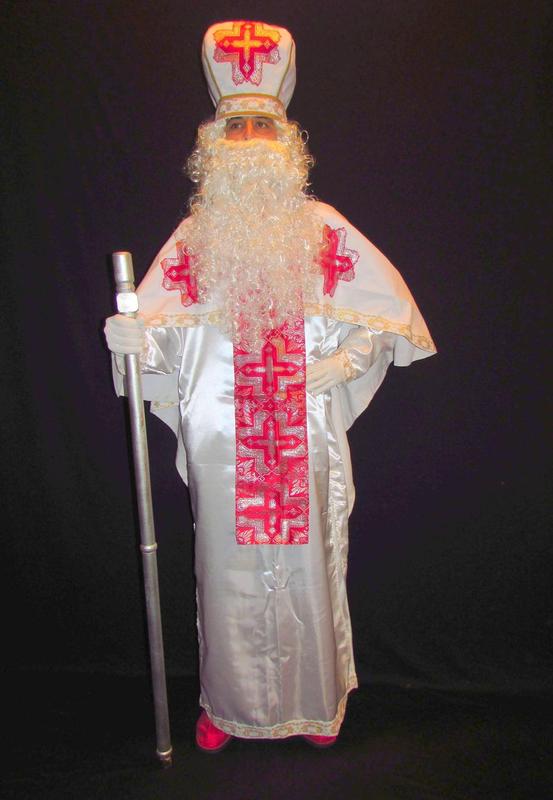 Костюм-комплект Святого Николая - МИНСКИЙ-4 . Код 230014 Костюм-комплект Святого Николая - МИНСКИЙ-4 отшивается в одном универсальном размере – 50-56 на рост 175-190 см В комплект костюма Святого Николая «МИНСКИЙ-4» входят: - Нижнее длинное облачение Святого Николая из белоснежного блестящего атласа или полусинтетической саржи-габардина, отороченная широкой бело-золотистой тесьмой по подолу и рукавам. - Верхнее парадно-праздничное облачение Святого Николая из полусинтетической саржи-габардина (или атласа) БЕЛОГО цвета, отороченное широкой бело-золотистой тесьмой по краю и вороту и богато украшенное вышитыми крестами (аппликации) и дополненная нарядной ризой красного цвета с вышитыми серебристыми крестами и символикой христианской тематики. - Шапка-митра Святого Николая на плотной корсажно-войлочной подкладке, верх - из полусинтетической саржи-габардина БЕЛОГО цвета. Митра украшена широкой бело-золотистой тесьмой по нижнему краю, тесьмой-косичкой золотистого цвета по ребрам митры, а также дополненная крестом (аппликация), вышитым серебряными нитями. - Белые нейлоновые (вязанные) перчатки стрейчевого типа Код 12005. - Реалистичная длинная борода «ГЕРЦОГСКАЯ». К********** см, 80-90 гр.). - Реалистичный вьющийся парик «Декабрьский». Код 01702. Вес – 120 грамм В комплект костюма Святого Николая «МИНСКИЙ-4» НЕ ВХОДЯТ (можно приобрести на нашем сайте дополнительно): 1. Посох Святого Николая (можно выбрать по размеру, длине, типу верхушки, цвету и материалу изготовления, конструкции (сборный или цельный) и цене посох Святого Николая с учётом вашего вкуса и потребностей). 2. Сапоги или валенки Святого Николая (можно купить дополнительно на нашем сайте различную обувь по технологии изготовления, материалу, высоте голенища, цене) 3. Брюки Святого Николая (можно выбрать по размеру, ткани, цвету). 4. Мешок для подарков Святого Николая (можно выбрать любой по размеру, ткани, цвету и цветовым оттенкам, с декором и без, с завязками простыми или со шнуром или меховыми опушками). 5. Микорофон портативный с усилителем и динамиком