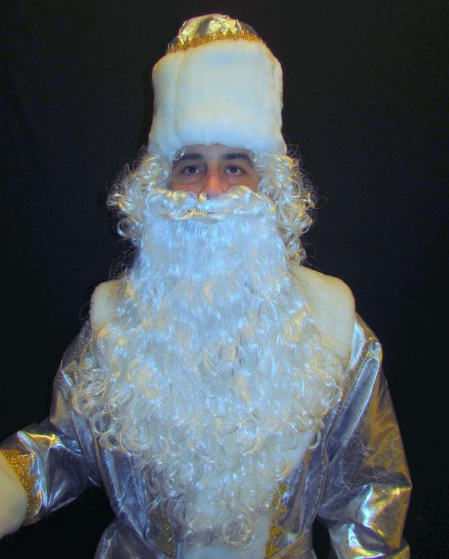 ## Костюм Св.Николая/Д.Мороза СЕРЕБРИСТО-КОЖАНЫЙ-3 р-р 50-56 . Код 107723 В постоянном наличии у нас эта модель костюма есть в универсальном размере – 50-56 на рост 175-195 см В комплект костюма входит: 1. Шуба на стёганной белой подкладке из СЕРЕБРИСТОЙ МЯГКОЙ ИСКУССТВЕННОЙ КОЖИ с «ЖАТОЙ» ЭФФЕКТНОЙ ФАКТУРОЙ, имитирующей натуральную кожу. Шуба по подолу оторочена широким белым мехом-мутоном. Этим же мехом оторочены рукава и линия запаха шубы. Дополнительным декором с дополнительным декором является орнаментальная ЗОЛОТИСТАЯ блестящая тесьма на полках шубы, вдоль меха, и вдоль меха по линии запаха. 2. Шапка на стёганной белой подкладке из СЕРЕБРИСТОЙ МЯГКОЙ ИСКУССТВЕННОЙ КОЖИ с «ЖАТОЙ» ЭФФЕКТНОЙ ФАКТУРОЙ, имитирующей натуральную кожу. Шапка оторочена белым мехом мутоном и дополнительно украшена объёмной орнаментальной ЗОЛОТИСТОЙ тесьмой с блеск-эффектом. 3. Эффектный пояс-кушак из СЕРЕБРИСТОЙ МЯГКОЙ ИСКУССТВЕННОЙ КОЖИ с «ЖАТОЙ» ЭФФЕКТНОЙ ФАКТУРОЙ, имитирующей натуральную кожу, украшенный меховыми опушками на концах. 4. Рукавицы на белой стёганой подкладке, из СЕРЕБРИСТОЙ МЯГКОЙ ИСКУССТВЕННОЙ КОЖИ с «ЖАТОЙ» ЭФФЕКТНОЙ ФАКТУРОЙ, имитирующей натуральную кожу. 5. Реалистичная Борода «ВЛАСТНАЯ» (40-45 см, 65-75 гр.). Код 02719. 6. Реалистичный вьющийся парик «ДЕКАБРЬСКИЙ». Код 01702. Вес – 120 грамм В комплект костюма «СЕРЕБРИСТО-КОЖАНЫЙ-3» НЕ ВХОДЯТ (можно приобрести на нашем сайте дополнительно): - Посох (можно выбрать любой по размеру, длине, типу верхушки, цвету и материалу изготовления, конструкции (сборный или цельный) и цене посох с учётом вашего вкуса и потребностей). - Сапоги или валенки (можно купить дополнительно на нашем сайте) различные по технологии изготовления, материалу, высоте голенища, цене - сапоги или валенки. - Мешок для подарков (можно выбрать любой по размеру, ткани, цвету и цветовых оттенков, с декором и без, с завязками простыми или со шнуром и меховыми опушками). - Микрофон портативный с усилителем и динамиком