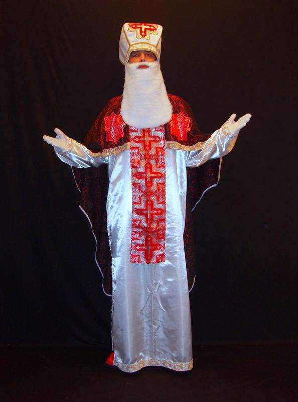 ## Костюм-комплект Святого Николая - КАРПАТСКИЙ-2 р-р 50-56. Код 230052 Костюм-комплект Святого Николая - КАРПАТСКИЙ-2 отшивается в одном универсальном размере – 50-56 на рост 175-190 см В комплект костюма Святого Николая «КАРПАТСКИЙ-2» входят: 1. Нижнее длинное облачение Святого Николая из белоснежного блестящего атласа или полусинтетической саржи-габардина, отороченная широкой бело-золотистой тесьмой по подолу и рукавам. 2. Верхнее парадно-праздничное облачение Святого Николая из плотного благородного жаккарда черно-красных тонов, отороченное широкой бело-золотистой тесьмой по краю и вороту и богато украшенное вышитыми крестами (аппликации) и дополненная нарядной ризой красного цвета с вышитыми серебристыми крестами и символикой христианской тематики. 3. Шапка-митра Святого Николая на плотной корсажно-войлочной подкладке, верх - из полусинтетической саржи-габардина БЕЛОГО цвета. Митра украшена широкой бело-золотистой тесьмой по нижнему краю, тесьмой-косичкой золотистого цвета по ребрам митры, а также дополненная крестом (аппликация), вышитым серебряными нитями. 4. Белые нейлоновые (вязанные) перчатки стрейчевого типа Код 12005. 5. Меховая большая борода «Окладистая». Код 02727. Длина – 44 см, ширина – 30 см. В комплект костюма Святого Николая «КАРПАТСКИЙ-2» НЕ ВХОДЯТ (можно приобрести на нашем сайте дополнительно): - Парик Святого Николая (можно выбрать по размеру, длине, пышности, качеству волоса и цене парик Святого Николая с учётом вашего вкуса и потребностей). - Посох Святого Николая (можно выбрать по размеру, длине, типу верхушки, цвету и материалу изготовления, конструкции (сборный или цельный) и цене посох Святого Николая с учётом вашего вкуса и потребностей). - Сапоги или валенки Святого Николая (можно купить дополнительно на нашем сайте различную обувь по технологии изготовления, материалу, высоте голенища, цене) - Брюки Святого Николая (можно выбрать по размеру, ткани, цвету). - Мешок для подарков Святого Николая (можно выбрать любой по размеру, ткани, цвету и цветовым оттенкам, с декором и без, с завязками простыми или со шнуром или меховыми опушками). - Микорофон портативный с усилителем и динамиком