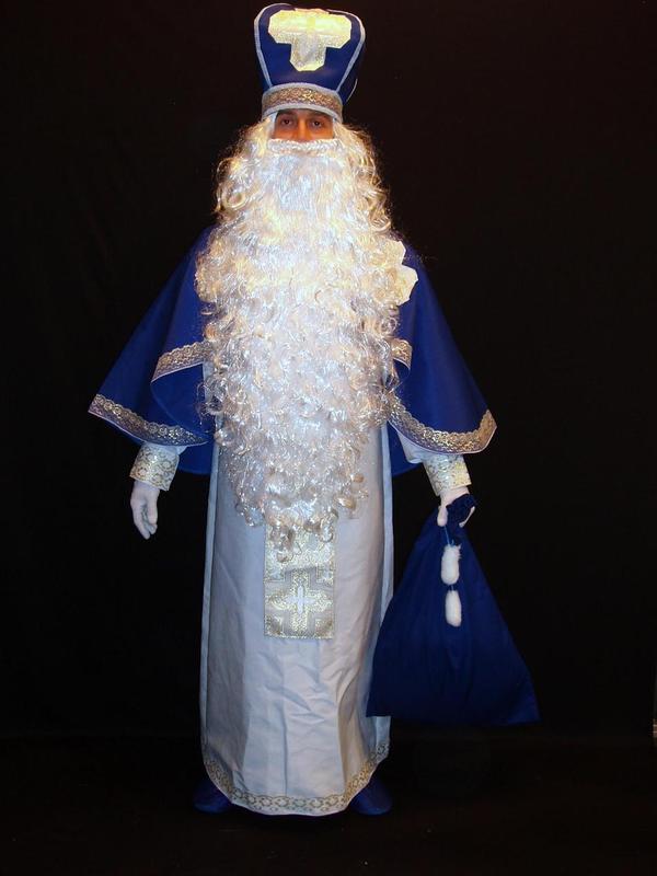 ## Костюм-комплект Святого Николая - ИВАНО-ФРАНКОВСКИЙ-7 р-р 46-54 Код 230297 Костюм-комплект Святого Николая - ИВАНО-ФРАНКОВСКИЙ-7 отшивается в одном универсальном размере – 46-54 на рост 170-190 см В данный комплект костюма Святого Николая ВХОДЯТ: 1. Риза - длинное (почти в пол) праздничное-торжественное облачение Святого Николая из белоснежно-белого, слегка блестящего, полусинтетического (с хлопком) эффектного материала саржево-габардинного типа (производство Италия), отороченное широкой (5 см) ажурной бело-золотистой тесьмой по подолу и манжетам-рукавам (10 см). 2. Верхняя христианская мантия Святого Николая из ГЛУБОКО-СИНЕГО оттенка «ЭЛЕКТРИК», слегка блестящего, полусинтетического (с хлопком) эффектного материала саржево-габардинного типа (производство Италия). Мантия Николая оторочена широкой (5 см) ажурной бело-золотистой тесьмой по всему периметру и в зоне воротника. Мантия богато украшена вышитыми ЗОЛОТОМ христианскими крестами (аппликации) по БЛАГОРОДНОМУ МОЛОЧНО-БЕЛОМУ ФОНУ и изобразительными элементами традиционной христианской символики. Мантия имеет скрытую пуговичную застежку сзади, на затылке. 3. Одним из главных и основополагающих элементов для создания полноценного образа Святого Николая является, входящая в комплект, шапка-митра Святого Николая. Митра сложного кроя и изготовлена по всем канонам православной и католической церквей. Жесткость конструкции и возможность сохранять форму достигнута в митре Святого Николая благодаря инновационной технологии пошива. Изделие имеет трёхслойную структуру. Внутренний слой, прилегающий к голове при надевании шапки – шёлковая подкладка белого цвета. Средний слой - основа головного убора Святого Николая - выполнена из современного плотного и при этом тонкого корсажно-войлочного материала, обеспечивающего упругость граней шапки, что в свою очередь, позволяет не только сохранять и поддерживать изначальную форму митры, а также возможность складывания изделия по граням (при транспортировке или хранении, например) с сохранением уникальной возможности вернуть исходную форму митры при распаковке. Верхний слой митры изготовлен из качественной смесевой полусинтетической, прочной и плотной ткани, не дающей усадки и не нуждающейся в декатировке (типа саржи-габардина) ГЛУБОКО-СИНЕГО цвета оттенка «ЭЛЕКТРИК». Головной убор Святого Николая украшен широкой ажурной бело-золотистой тесьмой по нижнему краю головного убора, а также рельефной тесьмой-«косичкой» БИРЮЗОВО-ГОЛУБОГО цвета по ребрам митры. Центральная часть митры украшена с лицевой стороны чрезвычайно эффектным крупным христианским крестом ЗОЛОТОГО ЦВЕТА, расшитым ЗОЛОТЫМИ металлизированными нитями (исполнен как пришивная аппликация). 4. Белые трикотажные (шитые) перчатки стретчевого типа (100% хлопок). Код товара13006. 5. Большая реалистичная борода с двойной резинкой «ВОЛЬНАЯ» (90 см, 285 грамм). Код 02708 6. Популярный качественный длинный мужской реалистичный парик «БЕЛЫЙ СНЕГ». Длинна -60-65 см. Вес – 140-150 грамм. Код товара 01704. 7. Прочный и вместительный мешок для подарков из синей основной ткани «ДЕКАБРЬСКИЙ» с завязками, украшенными меховыми помпонами (48х75 см). Код товара 12033. В данный комплект костюма Святого Николая НЕ ВХОДЯТ (можно приобрести на нашем сайте дополнительно): - Посох Святого Николая (можно выбрать по размеру, длине, 