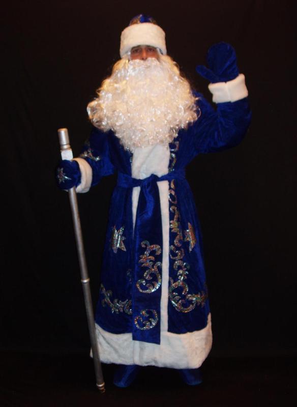 ## Костюм Св.Николая/Д.Мороза ВЕЛИЧЕСТВЕННЫЙ СИНИЙ-4 р-р 56-60 Код 08529/ 107914 В наличии размеры костюмов: 1. 50-54 (длина: 140 см, ширина: 71см) 2. 56-60 (длина: 145 см, ширина: 81 см) В комплект костюма входит: 1. Шуба Деда Мороза из СИНЕГО плотного бархата, отороченная белым мехом, на подкладке, аппликациями на полках шубы, рукавах и спине. 2. Шапка на подкладке, из СИНЕГО плотного банрхата, отороченная мехом, с двухсторонними аппликациями 3. Пояс из СИНЕГО плотного бархата с аппликациями. 4. Рукавицы на подкладке, из СИНЕГО плотного бархата, отороченные мехом, с аппликациями 5. Борода «Студёная». Код 02728. Длина – 35-37 см, вес – 70 грамм 6. Парик «Снежный блеск». Код 01701. Длина 50-55 см, вес 220 грамм В комплект костюма Деда Мороза «ВЕЛИЧЕСТВЕННЫЙ СИНИЙ-4» НЕ ВХОДЯТ (можно приобрести на нашем сайте дополнительно): - Посох Деда Мороза (можно выбрать любой по размеру, длине, типу верхушки, цвету и материалу изготовления, конструкции (сборный или цельный) и цене посох Деда Мороза с учётом вашего вкуса и потребностей). - Сапоги или валенки Деда Мороза (можно купить дополнительно на нашем сайте) различные по технологии изготовления, материалу, высоте голенища, цене - сапоги или валенки Деда Мороза. - Брюки Деда Мороза (можно купить дополнительно на нашем сайте). Есть все размеры брюк, на любой рост. Цвета – красный, синий, бордовый. - Мешок для подарков(можно выбрать любойпо размеру, ткани, цвету и цветовых оттенков, с декором и без, с завязками простыми или со шнуром и меховыми опушками). - Микрофон портативный с усилителем и динамиком и модератором-изменителем голоса.