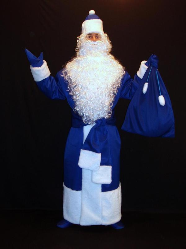 ## Костюм Св.Николая/Д.Мороза ПРАВОСЛАВНЫЙ СИНИЙ-6 р-р 50-56 Код 107676 Карнавальный комплект-костюм Деда Мороза «ПРАВОСЛАВНЫЙ СИНИЙ-6» отшивается в одном универсальном размере – 50-56 на рост 170-195 см. В данный комплект костюма Деда Мороза ВХОДЯТ: 1. Шуба Деда Мороза НАСЫЩЕННО-СИНЕГО цвета в оттенке «ЭЛЕКТРИК», отшита на белой стеганной подкладке, выполненная из прочной немнущейся полусинтетической (30% х/б +70% полиэстер) антиаллергенной ткани класса «А» итальянского производства. Шуба отороченна широкими полосами белого искусственного меха-мутона (отбеленный искусственный мех) по подолу и линии застежки (запаха), а также на рукавах. Шуба имеет роскошный эффектный шалевый воротник, изготовленный также из искусственного белоснежного меха-мутона. Застежки шубы – незаметные глазу «липучки», выполненные «в потай». 2. ШАПКА Деда Мороза (ДМ-5) «МЕЛОДИЧНАЯ» С МЕХОВЫМ ПОМПОНОМ (код товара 12072)НАСЫЩЕННО-СИНЕГО цвета в оттенке «ЭЛЕКТРИК»изготовлена из той же ткани, что и шуба Деда Мороза. Шапка-«ЧЕТЫРЁХ-КЛИНКА» выполнена на синтепоновой простеганной подкладке, что позволяет сохранять изделию исходную форму и препятствует нежелательным заминаниям. Шапка оторочена широкой (высота 13 см) полосой белоснежного меха-мутона. Украшает шапку меховой помпон, выразительно контрастирующий своей белоснежностью с основным цветом костюма. Высота шапки – 26 см. 3. Длинный (240 см) и очень широкий (17 см) пояс-кушак (ДМ-1), (240х12.5 см). Код товара 12074. Пояс выполненный из основной ткани, оторочен белоснежным мехом-мутоном на концах пояса. 4. РУКАВИЦЫ «СВЕЖИЕ» (ДМ-8), (длина – 25 см). Код товара 12089. Варежки Деда Мороза выполнены на синтепоновой простеганной подкладке из того же полусинтетического (с хлопком) эффектного материала саржево-габардинного типа (производство Италия) НАСЫЩЕННО-СИНЕГО цвета в оттенке «ЭЛЕКТРИК». 5. Большая реалистичная борода с двойной резинкой «ВЕЛИКАЯ» (90 см, 285 грамм). Код 02708 6. Популярный качественный длинный мужской реалистичный парик «БЕЛЫЙ СНЕГ». Длина -60-65 см. Вес – 140-150 грамм. Код товара 01704. 7. Вместительный и прочный мешок для подарков «ДЕКАБРЬСКИЙ» (48х75 см). Код товара 12033. Мешок из выполненный из того же полусинтетического (с хлопком) эффектного материала саржево-габардинного типа (производство Италия) НАСЫЩЕННО-СИНЕГО цвета в оттенке «ЭЛЕКТРИК» с синими завязками в тон основному цвету и с меховыми помпонами на концах этих завязок. В данный комплект костюма Деда Мороза НЕ ВХОДЯТ (можно приобрести на нашем сайте дополнительно): - Посох Деда Мороза(можно выбрать по размеру, длине, типу верхушки, цвету и материалу изготовления, конструкции (сборный или цельный) и цене посох Деда Мороза с учётом вашего вкуса и потребностей). - Сапоги или валенки Деда Мороза (можно купить дополнительно на нашем сайте различную обувь по технологии изготовления, материалу, высоте голенища, цене) - Брюки Деда Мороза(можно выбрать по размеру, ткани, цвету). - Микрофон портативный с усилителем и динамиком