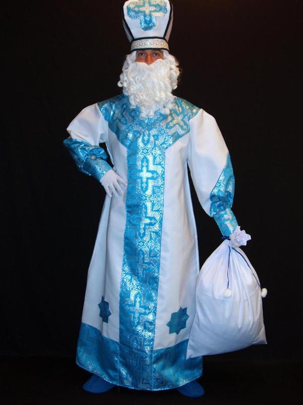 ## Костюм-комплект Святого Николая - ЛЬВОВСКИЙ-4 р-р 46-54 Код 230354 Костюм-комплект Святого Николая - ЛЬВОВСКИЙ-4 отшивается в одном универсальном размере – 46-54 на рост 170-195 см В состав данного комплекта костюма входят следующие аксессуары: 1. Риза - длинное (почти в пол) праздничное-торжественное облачение Святого Николая из белоснежно-белого, слегка блестящего, полусинтетического (с хлопком) эффектного материала саржево-габардинного типа (производство Италия). Воротник – стойка. Рукава сложного покроя, с пышными «фонариками» – комбинированные с высокими, регулируемыми «липучками», манжетами. Риза богато украшена вышитыми серебристыми металлизированными нитями по бирюзовому габардину христианскими крестами (аппликации) и другими элементами традиционной христианской символики. Риза имеет скрытую пуговичную застежку сзади, на затылке. 2. Уникальная шапка-митра Святого Николая - один из главных и основополагающих элементов для создания полноценного образа Святого Николая, Митра сложного кроя и изготовлена по всем канонам православной и католической церквей. Жесткость конструкции и возможность сохранять форму достигнута в митре Святого Николая благодаря инновационной технологии пошива. Изделие имеет трёхслойную структуру. Внутренний слой, прилегающий к голове при надевании шапки – шёлковая подкладка белого цвета. Средний слой - основа головного убора Святого Николая - выполнена из современного плотного и при этом тонкого корсажно-войлочного материала, обеспечивающего упругость граней шапки, что в свою очередь, позволяет не только сохранять и поддерживать изначальную форму митры, а также возможность складывания изделия по граням (при транспортировке или хранении, например) с сохранением уникальной возможности вернуть исходную форму митры при распаковке. Верхний слой митры изготовлен из качественной смесевой полусинтетической, прочной и плотной ткани, не дающей усадки и не нуждающейся в декатировке (типа саржи-габардина) БЕЛОСНЕЖНО- БЕЛОГО цвета. Головной убор Святого Николая украшен широкой кружевной ажурной бело-золотистой тесьмой по нижнему краю головного убора, а также рельефной тесьмой-«косичкой» ГЛУБОКОГО ТЁМНО-СИНЕГО цвета по ребрам митры. Центральная часть митры украшена с лицевой стороны чрезвычайно эффектным крупным христианским крестом БИРЮЗОВОГО ЦВЕТА, расшитым СЕРЕБРЯНЫМИ металлизированными нитями (исполнен как пришивная аппликация). 3. Белые нейлоновые (шитые) перчатки стретчевого типа. Код товара 12005. 4. Реалистичный природного естественного цвета человеческого седого волоса комплект (парик + борода) «РЕАЛ-КОМПЛЕКТ». (вес парика – 130 гр., вес бороды – 80 гр). Код товара 03729 5. Прочный и вместительный Мешок Деда Мороза (75х48 см) «БЕЛЫЙ АИСТ» с СИНИМИ завязками, украшенными меховыми помпонами. Код товара 12125. В состав данного комплекта костюма НЕ ВХОДЯТ (можно приобрести на нашем сайте дополнительно): - Плащаница-мантия Святого Николая, представляющая собой «плащ-накидку» прозрачно-белого цвета, выполненную из лёгкой шёлковой ткани и отороченную широкой (5 см. шириной) ажурной кружевной тесьмой, вышитой христианским каноническим орнаментом по гипюровой основе. (можно глянуть на этот аксессуар, посмотреть несколько фото и узнать о нем больше, если введёте в поисковую строку на сайте код товара: 230000 - Посох 