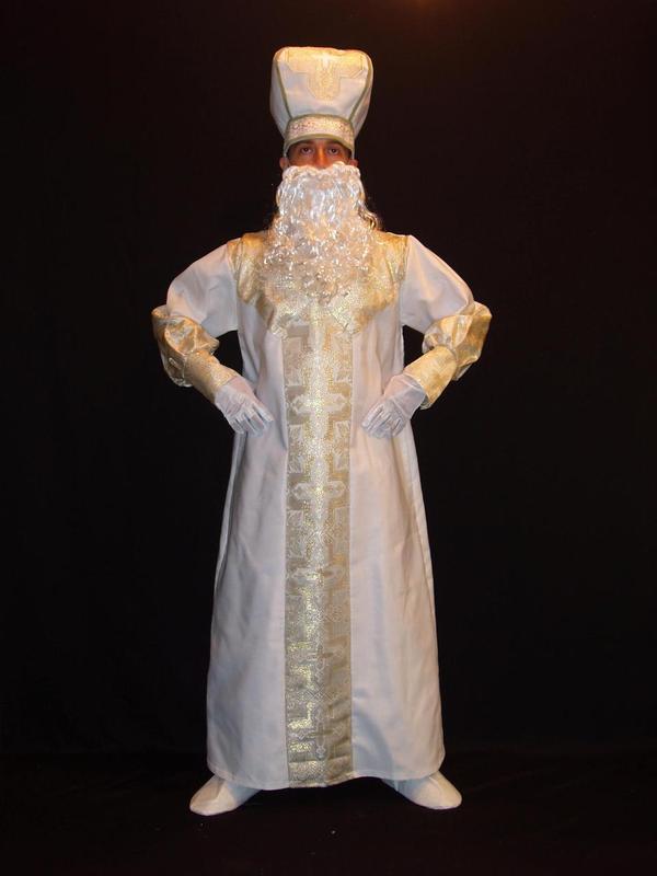 ## Костюм-комплект Святого Николая - РОВНЕНСКИЙ-1 р-р 46-54 Код 230371 Костюм-комплект Святого Николая - РОВНЕНСКИЙ-1 отшивается в одном универсальном размере – 46-54 на рост 170-195 см В состав данного комплекта костюма входят следующие аксессуары: 1. Риза - длинное (почти в пол) праздничное-торжественное облачение Святого Николая из белоснежно-белого, слегка блестящего, полусинтетического (с хлопком) эффектного материала саржево-габардинного типа (производство Италия). Воротник – стойка. Рукава сложного покроя, с пышными «фонариками» – комбинированные с высокими, регулируемыми «липучками», манжетами. Риза богато украшена вышитыми ЗОЛОТЫМИ металлизированными нитями по БЕЛО-МОЛОЧНОМУ габардину христианскими крестами (аппликации) и другими элементами традиционной христианской символики. Риза имеет скрытую пуговичную застежку сзади, на затылке. 2. Уникальная шапка-митра Святого Николая - один из главных и основополагающих элементов для создания полноценного образа Святого Николая, Митра сложного кроя и изготовлена по всем канонам православной и католической церквей. Жесткость конструкции и возможность сохранять форму достигнута в митре Святого Николая благодаря инновационной технологии пошива. Изделие имеет трёхслойную структуру. Внутренний слой, прилегающий к голове при надевании шапки – шёлковая подкладка белого цвета. Средний слой - основа головного убора Святого Николая - выполнена из современного плотного и при этом тонкого корсажно-войлочного материала, обеспечивающего упругость граней шапки, что в свою очередь, позволяет не только сохранять и поддерживать изначальную форму митры, а также возможность складывания изделия по граням (при транспортировке или хранении, например) с сохранением уникальной возможности вернуть исходную форму митры при распаковке. Верхний слой митры изготовлен из качественной смесевой полусинтетической, прочной и плотной ткани, не дающей усадки и не нуждающейся в декатировке (типа саржи-габардина) БЕЛОГО цвета. Головной убор Святого Николая украшен широкой (5 см) кружевной ажурной бело-золотистой тесьмой по нижнему краю головного убора, а также рельефной тесьмой-«косичкой» ЗОЛОТОГО цвета по ребрам митры. Центральная часть митры украшена с лицевой стороны чрезвычайно эффектным крупным христианским крестом БЕЛО-МОЛОЧНОГО ЦВЕТА, расшитым ЗОЛОТЫМИ металлизированными нитями (исполнен как пришивная аппликация). 3. Белые нейлоновые (шитые) перчатки стретчевого типа. Код товара 12005 4. Небольшая, но реалистичная борода «УЮТНАЯ». (длина: 31-33 см, вес: 40-45 гр.). Код товара 02726. В состав данного комплекта костюма НЕ ВХОДЯТ (можно приобрести на нашем сайте дополнительно): - Плащаница-мантия Святого Николая, представляющая собой «плащ-накидку» прозрачно-белого цвета, выполненную из лёгкой шёлковой ткани и отороченную широкой (5 см. шириной) ажурной кружевной тесьмой, вышитой христианским каноническим орнаментом по гипюровой основе. (можно глянуть на этот аксессуар, посмотреть несколько фото и узнать о нем больше, если введёте в поисковую строку на сайте код товара: 230000 - Парик Святого Николая (можно выбрать по размеру, длине, пышности, качеству волоса и цене парикСвятого Николая с учётом вашего вкуса и потребностей). - Мешок для подарков Святого Николая (можно выбрать любой по размеру, ткани, цвету и цветовым от