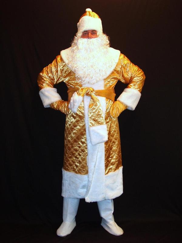 ## Костюм Св.Николая/Д.Мороза ЗЛАТОПРАЖСКИЙ-4 размер 50-56 Код 107594 Златопражский-4", идеален для Св. Николая или Деда Мороза, в универсальном размере 50-56 (рост 170-195 см). Комплект включает: 1. Шубу: золотой атлас на синтепоне с белой шелковой подкладкой, украшенную белым мутоновым мехом и шалевым воротником. Застежки на "липучках". 2. Шапка: из того же материала, с меховым помпоном и мутоновой окантовкой. 3. Пояс: длинный и широкий из золотого материала с меховыми концами. 4. Перчатки: из золота на белой подкладке. 5. Бороду: "Знатная" (55 см, 125 гр.). Код 02716. 6. Парик: "Декабрьский" (120 грамм). Код 01702. Дополнительно можно приобрести: - Мешок для подарков (широкий выбор). - Посох (на любой вкус). - Обувь (различные варианты). - Брюки (по выбору). - Микрофон для голоса.