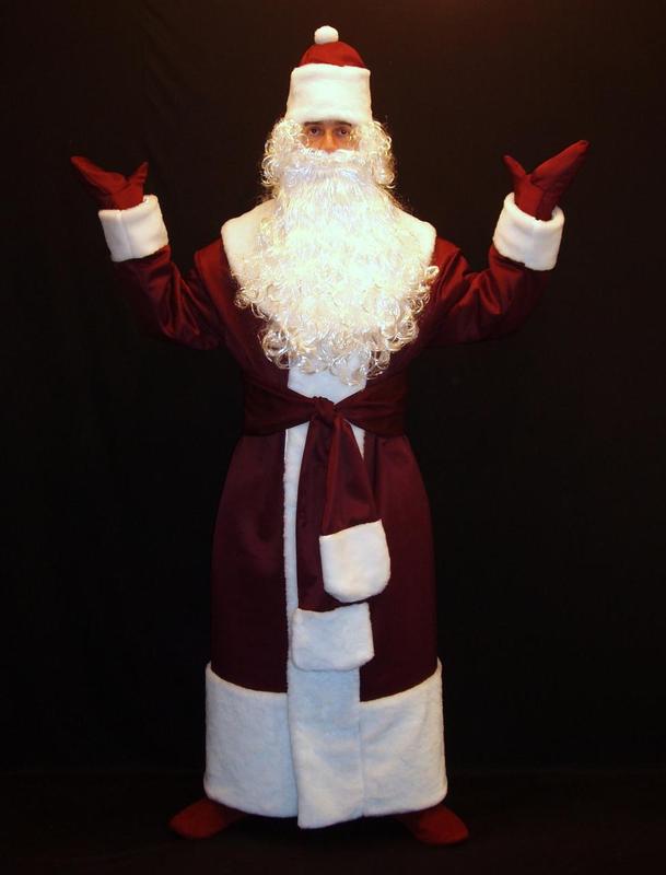 Костюм Св. Н иколая/Д.Мороза ПРАВОСЛАВНЫЙ БОРДО-3 р-р 50-56. Код 107663 Карнавальный комплект-костюм Деда Мороза «ПРАВОСЛАВНЫЙ БОРДО-3» отшивается в одном универсальном размере – 50-56 на рост 170-195 см. В данный комплект костюма Деда Мороза ВХОДЯТ: 1. Шуба Деда Мороза на белой стеганной подкладке из БЛАГОРОДНО-БОРДОВОГО цвета оттенка «СПЕЛАЯ ВИШНЯ», выполненная из прочной немнущейся полусинтетической (30% х/б +70% полиэстер) антиаллергенной ткани класса «А» итальянского производства. Шуба отороченна широкими полосами белого искусственного меха-мутона (отбеленный искусственный мех) по подолу и линии застежки (запаха), а также на рукавах. Шуба имеет роскошный эффектный шалевый воротник, изготовленный также из искусственного белоснежного меха-мутона. Застежки шубы – незаметные глазу «липучки», выполненные «в потай». 2. ШАПКА Деда Мороза (ДМ-5) «МЕЛОДИЧНАЯ» С МЕХОВЫМ ПОМПОНОМ (код товара 12113) БЛАГОРОДНО-БОРДОВОГО цвета в оттенке «СПЕЛАЯ ВИШНЯ»изготовлена из той же ткани, что и шуба Деда Мороза. Шапка-«ЧЕТЫРЁХ-КЛИНКА» выполнена на синтепоновой простеганной подкладке, что позволяет сохранять изделию исходную форму и препятствует нежелательным заминаниям. Шапка оторочена широкой (высота 13 см) полосой белоснежного меха-мутона. Украшает шапку меховой помпон, выразительно контрастирующий своей белоснежностью с основным цветом костюма. Высота шапки – 26 см. 3. Длинный (240 см) и очень широкий (17 см) пояс-кушак (ДМ-1), (240х12.5 см). Код товара 12118. Пояс выполненный из основной ткани, оторочен белоснежным мехом-мутоном на концах пояса. 4. РУКАВИЦЫ «СВЕЖИЕ» (ДМ-8), (длина – 25 см). Код товара 12108. Варежки Деда Мороза выполнены на синтепоновой простеганной подкладке из того же полусинтетического (с хлопком) эффектного материала саржево-габардинного типа (производство Италия) БЛАГОРОДНО-БОРДОВОГО цвета оттенка «СПЕЛАЯ ВИШНЯ». 5. Добротная среднеразмерная реалистичная борода «ЗНАТНАЯ» (55 см, 125 гр.). Код товара 02716. 6. Реалистичный вьющийся парик «ДЕКАБРЬСКИЙ». Вес – 120 грамм. Код товара 01702. В данный комплект костюма Деда Мороза НЕ ВХОДЯТ (можно приобрести на нашем сайте дополнительно): - Мешок для подарков Деда Мороза (можно выбрать любой по размеру, ткани, цвету и цветовым оттенкам, с декором и без, с завязками простыми или со шнуром или меховыми опушками). - Посох Деда Мороза (можно выбрать по размеру, длине, типу верхушки, цвету и материалу изготовления, конструкции (сборный или цельный) и цене посох Деда Мороза с учётом вашего вкуса и потребностей). - Сапоги или валенки Деда Мороза (можно купить дополнительно на нашем сайте различную обувь по технологии изготовления, материалу, высоте голенища, цене) - Брюки Деда Мороза (можно выбрать по размеру, ткани, цвету). - Микрофон портативный с усилителем и динамиком