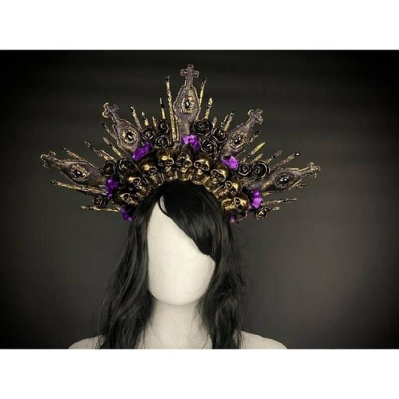 ОБРУЧ АДА 22-341BLK-VT Коллекция: Головные уборы Материал: синтетическая ткань, пластик, металл Цвет: чёрный, фиолетовый Высота композиции 18см. Оригинальный головной убор, декорированный чёрно-золотыми розами, пластиковыми черепами 5см., пластиковыми лучами, крестами shine.