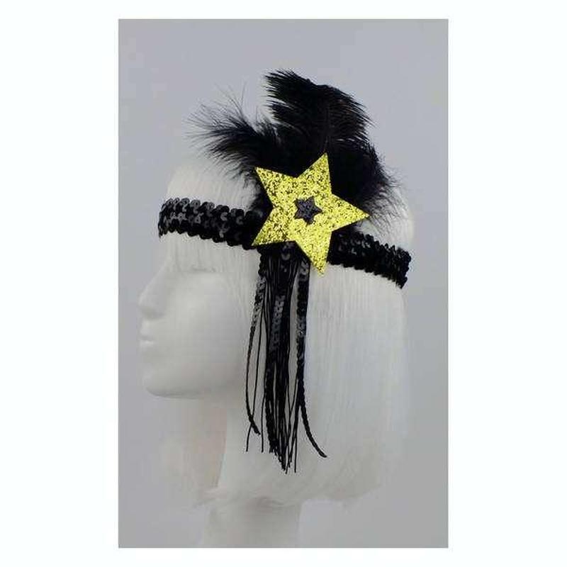 Резинка на голову Star Основной аксессуар для женского карнавального ретро образа. Резинка покрыта пластиковыми пайетками, декорирована золотистой звездой shine. Стильный аксессуар для новогоней вечеринки. Ширина резинки - 3 см (растягивается).Высота пера - до 20 см..