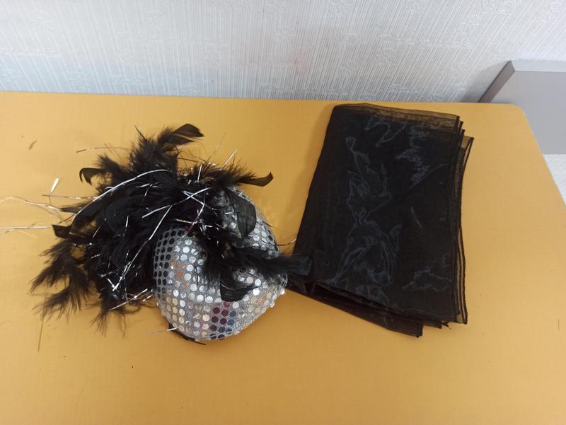 шляпка с блестками и черными перьями и черный шарф , карнавальный