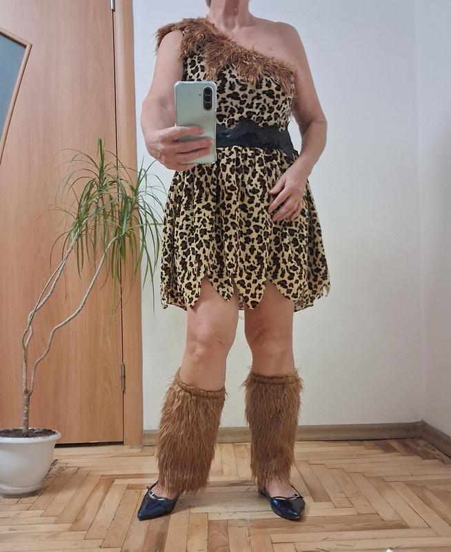 Классный карнавальный костюм пещерной женщины, каменный возраст или ваш вариант. Состояние очень красивое. Платье леопардовое украшение на одно плечо, украшено мехом. Пояс кожаный, сапожки мех. Спинка платья длиннее перед. Выглядит супер. Размер указан 12-14 Пог-47-50, ПОТ-39-50, бедра -65, от плеча до талии-45, длина-94 см.