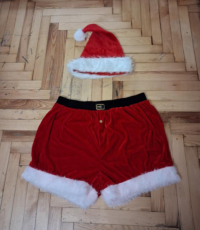 Классный карнавальный шутический костюм Санты, шорты-трусы и шапка. Шорты велюровые. По талии черная резинка, имитация пояса. Стан идеален. Размер указан ХХЛ Пот-45-60, Поб-67, длина-43 см.