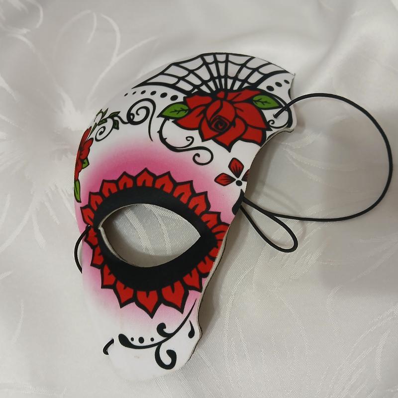 Маска с дизайном сахарного черепа, полумаска, на хелловин сахарный череп изображает стилизованный череп, часто украшенный цветочными и другими орнаментами. Несмотря на изображение черепа, эти маски символизируют жизнь и память