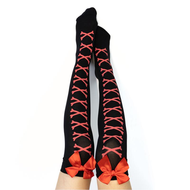 Чулки Хэллоуин Кости с бантом (черные с красным) - поможет завершить свой мрачный образ на Хэллоуин. Нейлоновые чулки с изображением шнуровки с бантом идеально подходят для создания образа на тематический праздник День мертвых или Марди Гра. Чулки на резинке оптом и по дропшиппингу Вы можете купить в интернет магазине Карнавал Приколов.