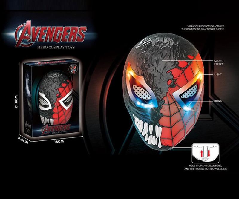 Маска на светящаяся батарейках с уникальным дизайном, где одна половина представляет Человека-Паука, а другая - Венома, создает невероятный контраст между двумя персонажами. Идеальный аксессуар для фанатов, который привлекает внимание и добавляет динамичности любому костюму.