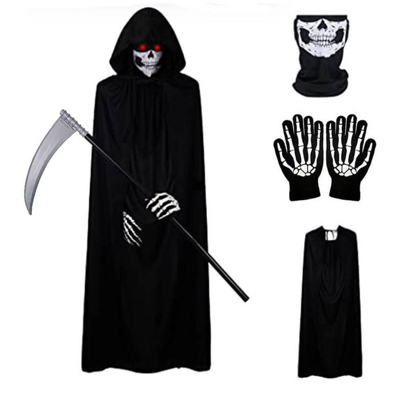 ## Набор взрослый : Плащ с капюшоном, Коса Смерти, Маска Череп, Перчатки Скелет 081084/ 081077 В данный комплект входят 4 аксессуара (5 предметов), а именно: 1. Коса Смерти, Коса жнеца 90х34 см. на Хеллоуин. Пластик. Разборна 2. Маска Черепа с челюстью в форме балаклавы или шарфа 3. Перчатки Скелетные на взрослую руку (пара) 4. Плащ чёрный длиной с капюшоном на рост 175-190 см Описание Плаща с капюшоном Длинный плащ ЧЁРНЫЙ, накидка, длина 150 см с капюшоном для образа Смерти, Колдуна, Ведьмы, Дракулы, Демона, Вампира, на Хеллоуин и для других образов. Унисекс. Подходит для мужских и женских карнавальных образов. Цвет: глубокий, насыщенный чёрный Длина 150 см (при вашем росте 175-180 см – будет касаться пола) Ширина – 140 см Высота капюшона – 35 см Вес – 200 грамм Ткань: нежный тонкий, приятный к телу, шелковистый, лёгкий. «летящий» при движении. Полиэфирный синтетический материал Описание Перчаток Размеры: 24х12см (подходят на любую взрослую в том числе мужскую руку и соответствуют размерам перчаток № 8,9, 10). Тянутся, облегают руку. Цвет:черный с белым изображением костей кисти руки Материал: полиэстер со стрейтчевым эффектом с объёмным рельефным нанесенным рисунком Производитель: Китай Перчатки Скелета мужские короткие выполнены из прочного и эластичного материала. Описание Маски-балаклавы Маска-Балаклава. Шарф «ЧЕРЕП-ЧЕЛЮСТЬ» изготовлен из нежного, мягонького, приятного к телу полиэстера, с небольшим трикотажно-стрейтчевым качеством. Маска выразительно смотрится благодаря контрастности основного смоляно-чёрного цвета изделия и ярко-белого рисунка черепа-челюсти. Универсальный размер, унисекс, подходит для мужчины, девушки, парня, подростка. Рекомендуется как эффектный и необычный карнавальный аксессуар, как маска-шарф для Хеллоуина Описание Косы Жнеца или Косы Смерти для косплея Качественный пластик. Легко разбирается на 4 части Карнавальная коса для косплея изготовлена из пустотелого пластика и поэтому достаточно легкая. Аксессуар отлично дополнит образ на тематической вечеринке или празднике Хэллоуин. Коса Жнеца — классический элемент образа Смерти или мрачного персонажа, используемый как украшение или реквизит на Хэллоуин. Изделие состоит из сборно-разборной (на скрчивание по резьбе) пластиковой ручки длиной 90 см и большого изогнутого лезвия длиной 34 см. Лёгкий вес и безопасная форма делают её подходящей как для взрослых, так и для детей (под присмотром). Коса отлично дополнит костюм Смерти, жнеца или любого мрачного персонажа, а также может использоваться как самостоятельный элемент декора для фотозон, дверей или стен. Подходит для вечеринок, спектаклей, тематических мероприятий и оформления пространства.