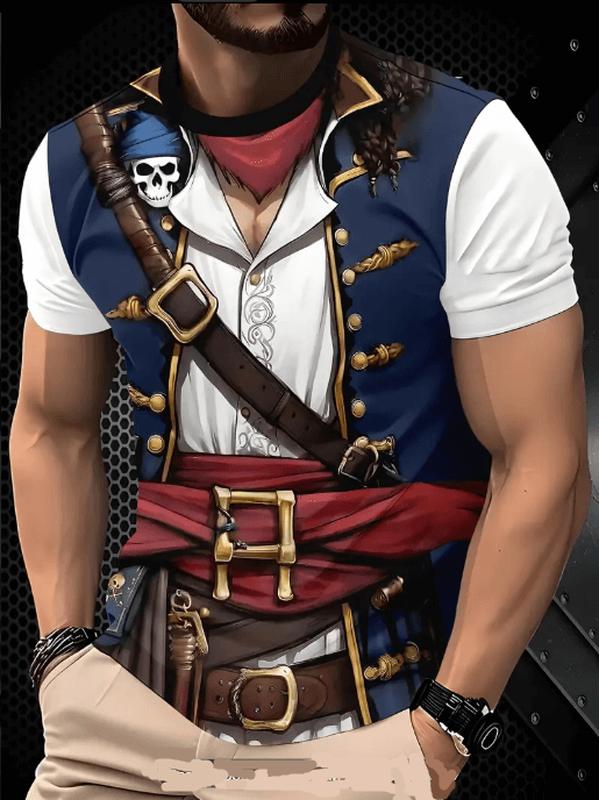 ## Костюм, футболка Пирата. 3D-принт. ХL, рост 185-190 см. Мод 2 Код 08893/ 081201 Вначале проверьте свои подлинные размеры. Наш товар 3ХL (не верим в маркировку!) имеет следующие параметры (сравните со своими обмерами): Объём груди – 105-110 см Объём талии – 91-86 см Рекомендуемый рост 185-190 см Примечание: если ваш размер меньше указанных – не беда, ведь главное, чтобы футболка-костюм не была мала и коротка! Покупка полноценного взрослого карнавального костюма Пирата или Пиратки в хорошем и полноценном наборе, как известно многим, может оказаться не только непростой задачей, но и довольно затратным мероприятием. Подобрать все элементы, чтобы образ был завершённым и эффектным, требует времени, усилий и значительных финансовых вложений. Но, к счастью, есть более удобный и доступный вариант! Прогрессивная по технологии изготовления футболка, украшенная объёмным цветным 3D-принтом, способна стать не просто компромиссным решением, а действительно выигрышной альтернативой полноценному пиратскому костюму. Футболка заменит Вам не только сам костюм матёрого Пирата, но и ещё добавит 2 ремня с пряжками, кафтан, рубаху пиратскую, шейный платок, эмлематику, красный пояс с золотой пряжкой… Как видно, она способна заменить сразу несколько ключевых элементов образа. Ну, разве что надо будет добавить собственные чёрные брюки и докупить оружие, наглазник с черепом, бандану на голову или пиратскую шапку… и получить желаемый результат: вы самый обоятельный, красивый, грозный и бесстрашный капитан на вашей пиратской вечеринке! Такой вариант не только облегчает подготовку к празднику, но и экономит бюджет, не теряя при этом выразительности образа. В результате вы получите цельный и узнаваемый образ — вы обаятельный, смелый и грозный Пират, готовый блистать на пиратской вечеринке!